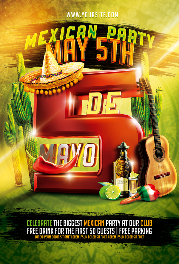 Cinco de Mayo is less about a celebration of the Mexican Independence Day, and more of a promise to increase tequila sales. Like every late night party club, you are pushing with the concept that this party will be full of hot chicks who are loose from drinking too much. Pack your post design with the red, white, and green theme, and don’t forget the lens flares!