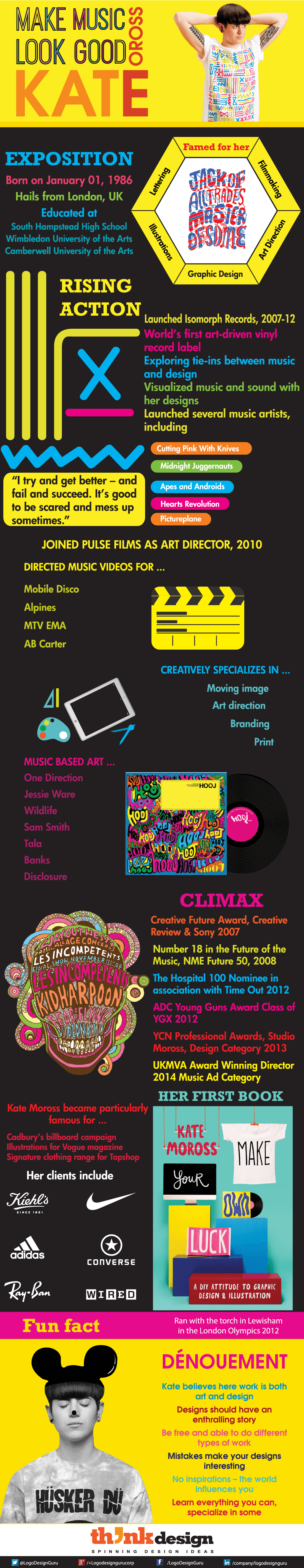 If our work defines us then this is how Kate Moross can be defined. This young girl made a career out of solving design problems and made a name for herself in art direction, film making, and typography. Moross ran with the Torch in Lewisham for the London Olympics in 2012. By that time, she was already popular for the nationwide billboard campaign for Cadburys and a signature clothing range for Top Shop. And you know what? She’s just getting started. Her unique design ideas made with her personal punk-revolutionary touch has roused a refreshed, heightened appreciation for colors, illegible typography, post-punk, and three-sided shapes. So, hold tight because she has more dazzling ideas to surprise us all.