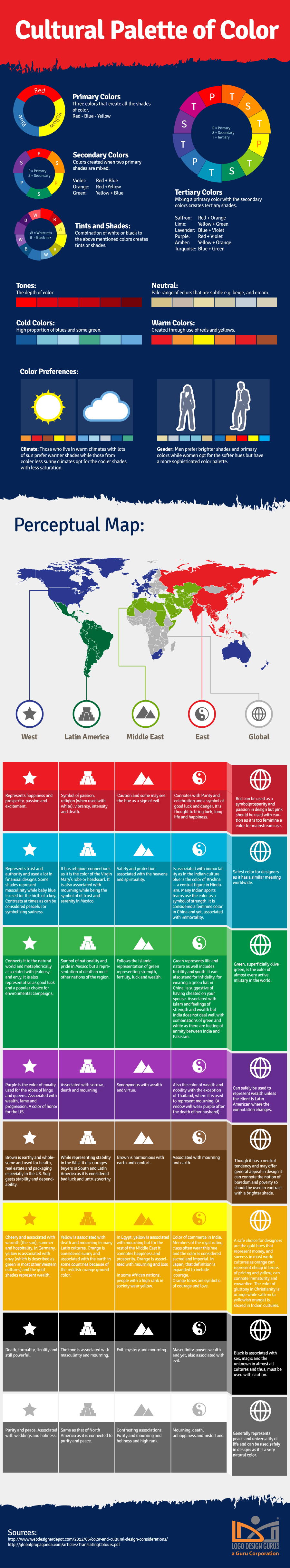 When graphic designers choose colors for their designs they are usually led by personal preferences, color palette combinations, industry or client selections. However, what they tend to ignore is the cultural significance of color. The idea of a cultural palette of color was set forth by students Sandra E. Moriarty and Lisa Rohe, who wrote a thesis on “Cultural Palettes: An Exercise in Sensitivity for Designers.”