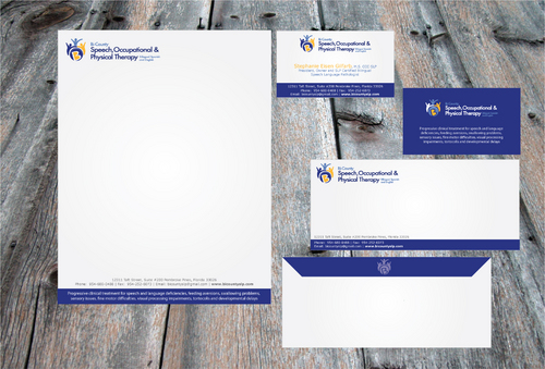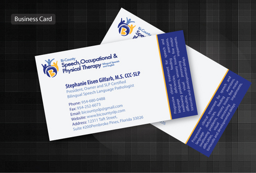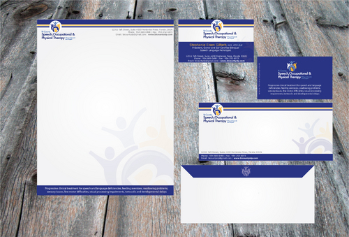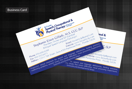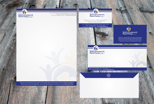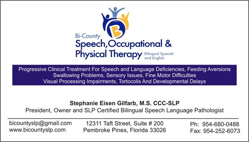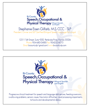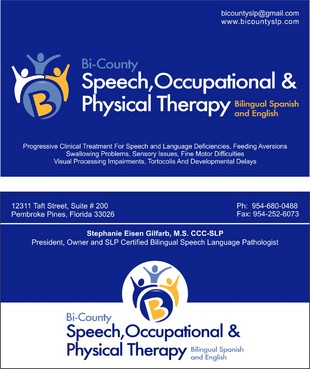 Please include the following phrase on business card and letterhead: Progressive clinical treatment for speech and language deficiencies, feeding aversions, swallowing problems, sensory issues, fine motor difficulties, visual processing impairments, tortocolis and developmental delays