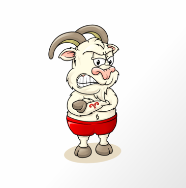 Cartoon character style Billy Goat. Aggressive looking. The Goat should be standing on two legs. Front legs crossed. Tattoos on front arms. Red silk boxer style underwear shorts.