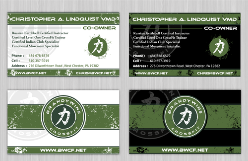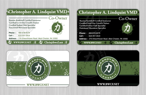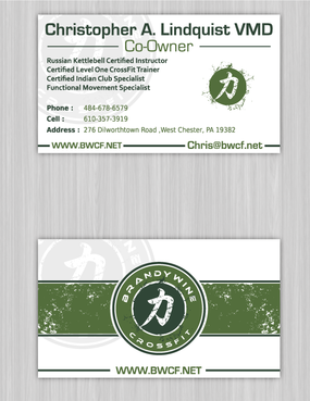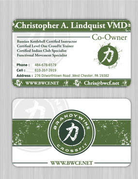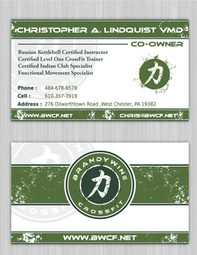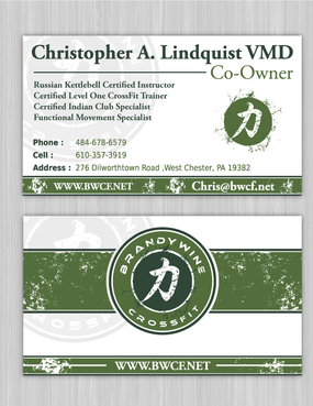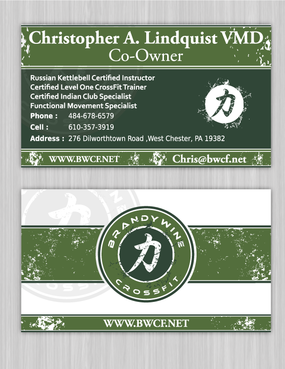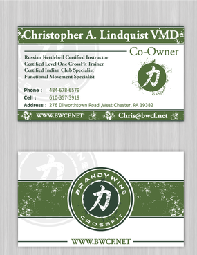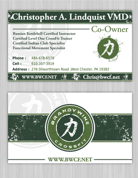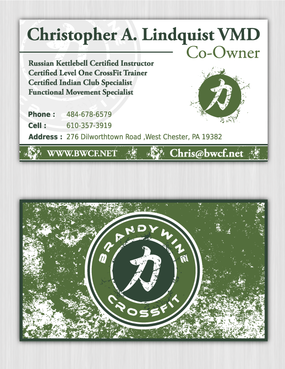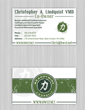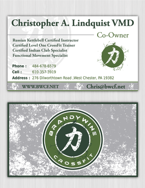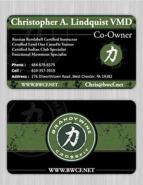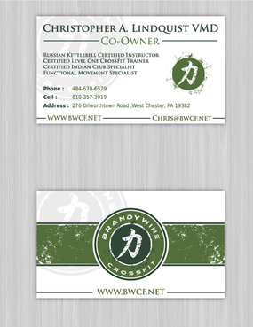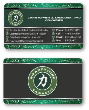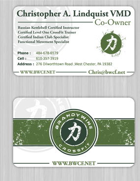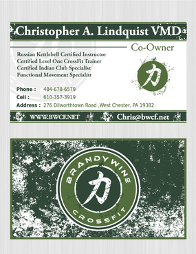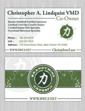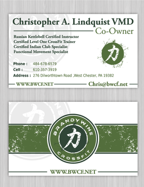 One side of the card should be the large Brandywine CrossFit logo and associated graphics. On the other side, should be my name and all the information about me and the business. If appropriate, use of another related logo could go here. We have the Russian Imperial Crest with BWCF over it or the Centered Strength logo from the center of the Brandywine CrossFit logo. Remember that Centered Strength and Brandywine CrossFit are about anciet wisdom and modern truth.