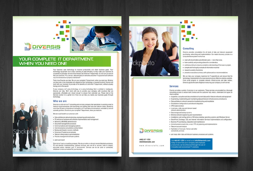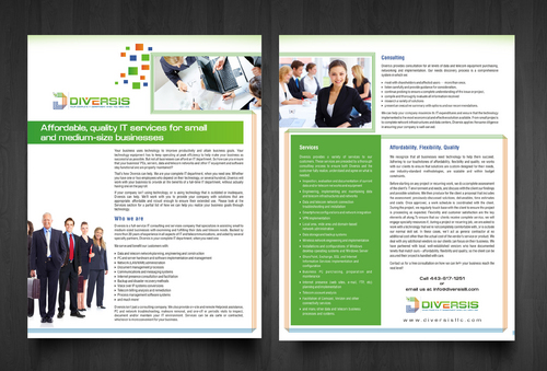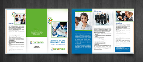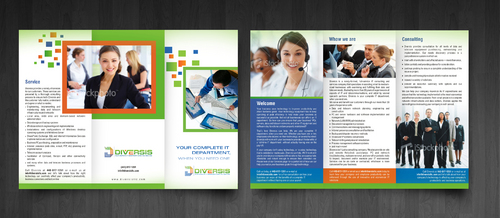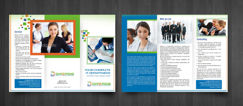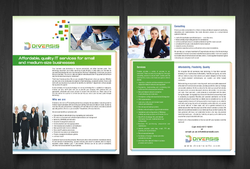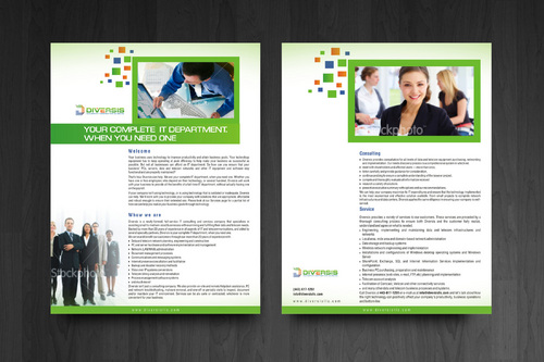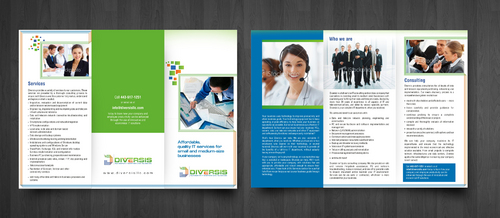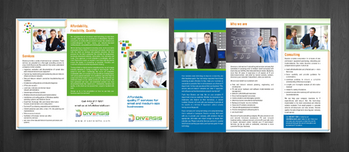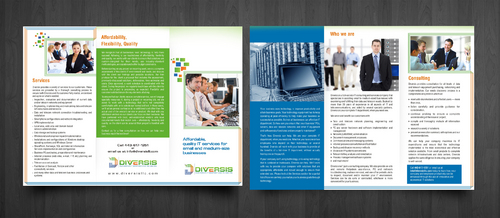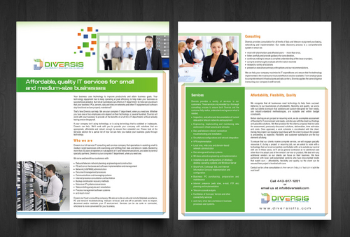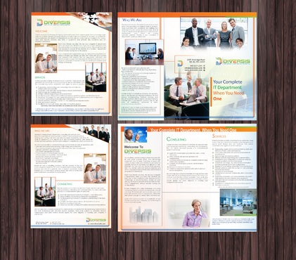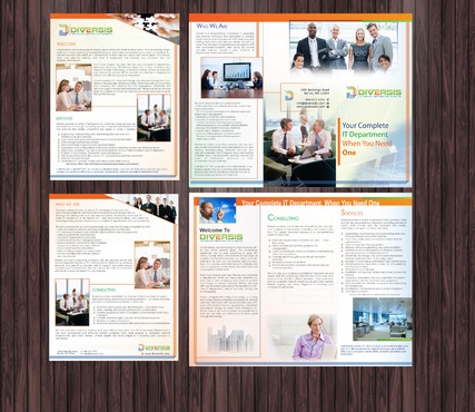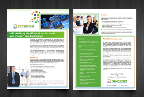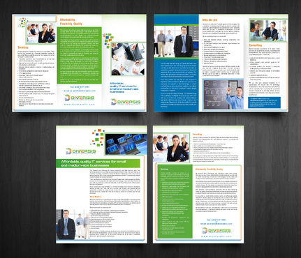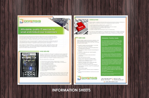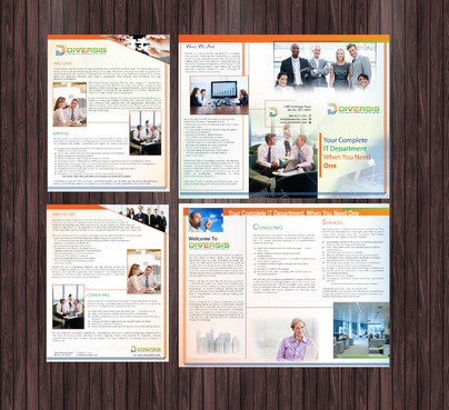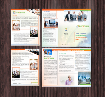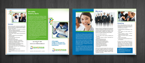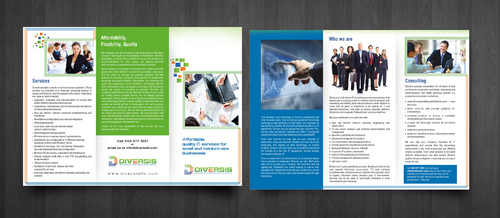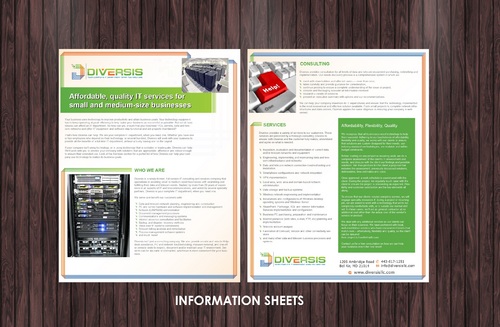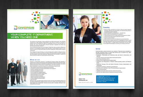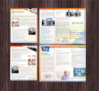 Must use already designed colors and logos, use text from www.diversisllc.com to complete the brochure and two-sided sheet. Be accepting of additional information to be included before project end.