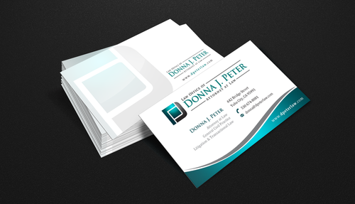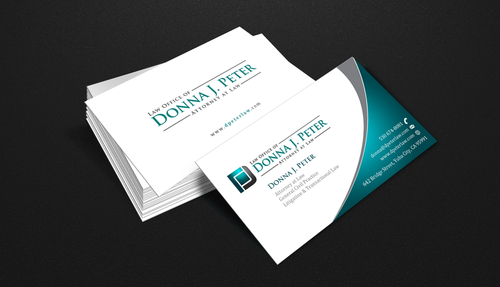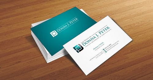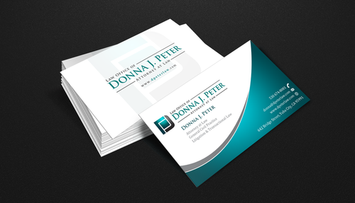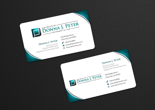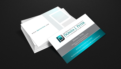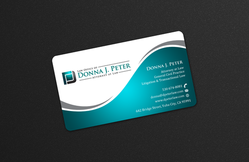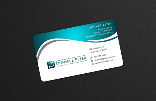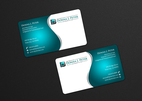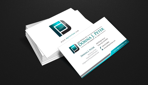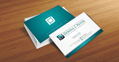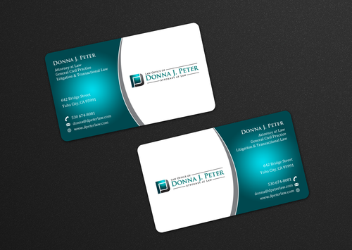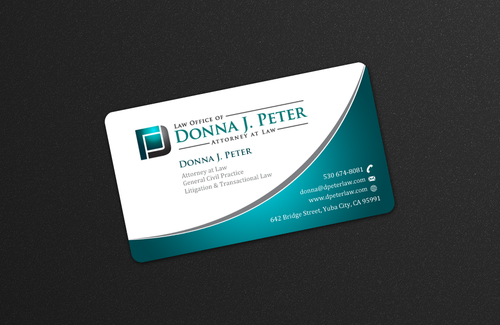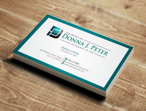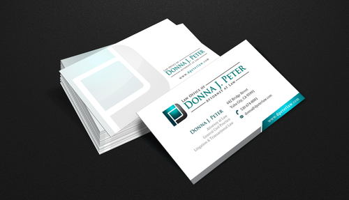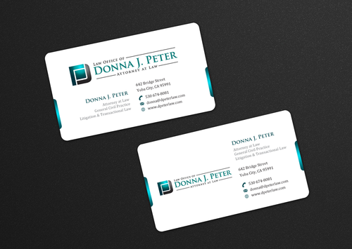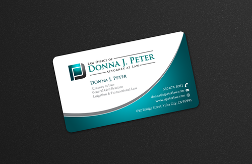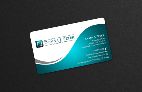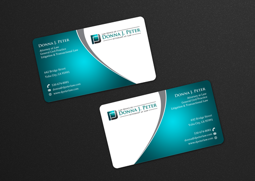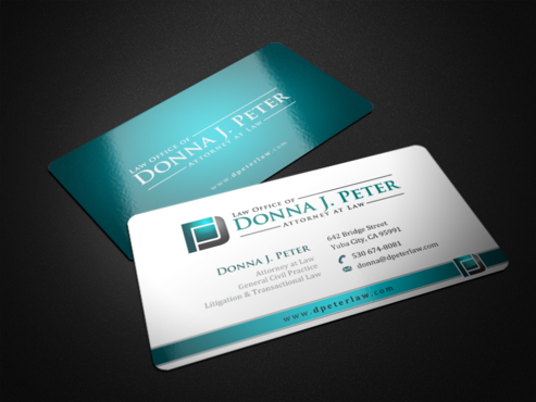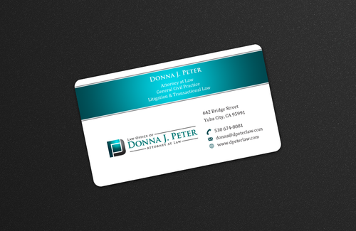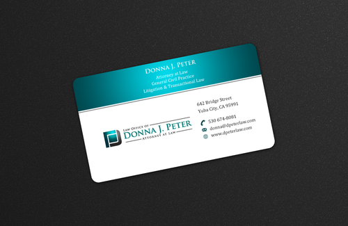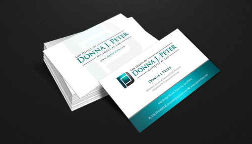 I would like just my logo on the front of the card. On the back I would like "Donna J. Peter, J.D." I would also like it to say "General Civil Practice" and "Litigation and Transactional Law" I would like my telephone number in bold, very easy to find and read. I would like my address, webpage, and e mail address included.