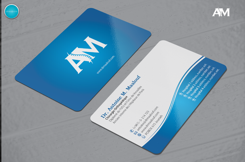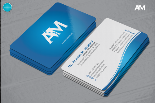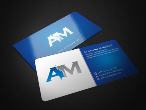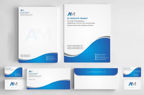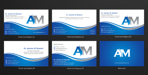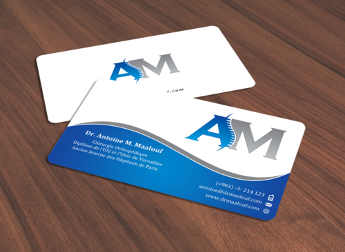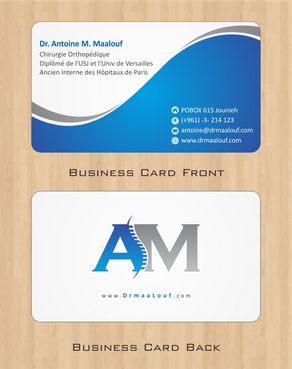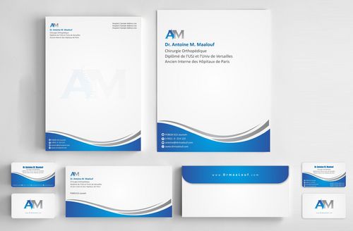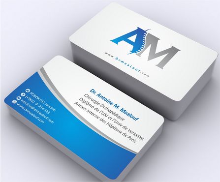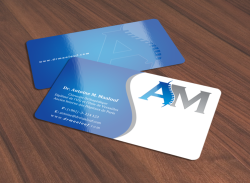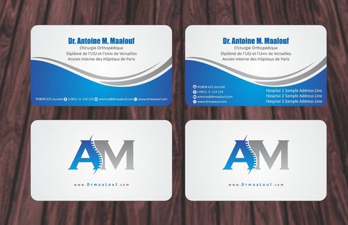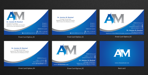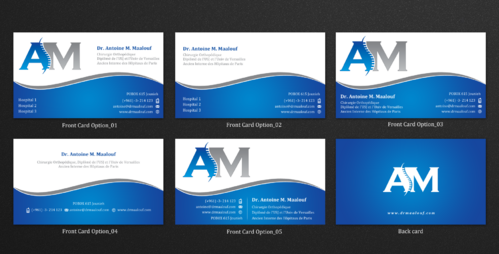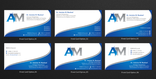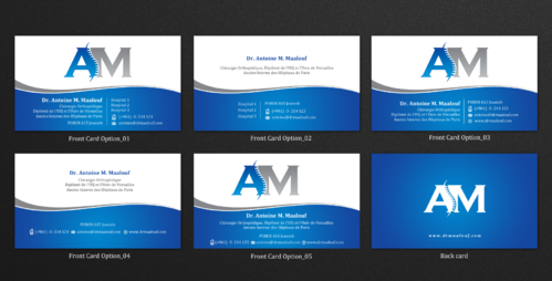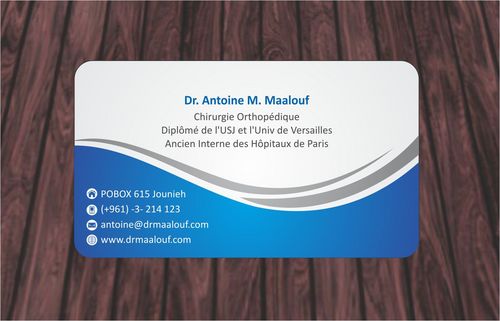 Concerning the business card, which matters most, please take into consideration the following: 1/ I need my name to be followed below it by my specialty and credentials, each on a separate line as follows Dr. Antoine M. Maalouf Chirurgie Orthopédique Diplômé de l'USJ et l'Univ de Versailles Ancien Interne des Hôpitaux de Paris 2/ I do not want any address to be listed 3/ my logo can be used either in the front but in a disrete way, or on the back as a watermark or in a corner....i will see which design is more clean and professional. 4/ Concerning the back of the business card, i need please TWO variations: - one without any text on the back except perhaps the logo or website, as u wish -and another one where you provide a place i can input four addresses myself later on ( you can write for now Hospital 1, address, tel...Hospital 2, address, tel , etc.. and i will edit them myself later on)
