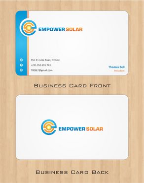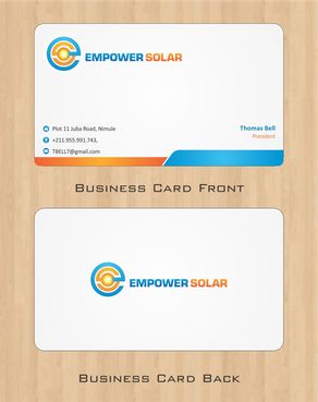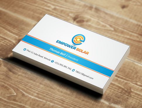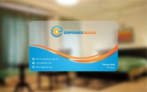 Would like a clean crisp professional business card design. Please integrate logo well and also include our motto: "making solar affordable" If you can find a clever way to include all 3 physical addresses then please include, otherwise only include South Sudan address. Phones and email are most important. Would like pictures of our products on the back of the business card, will include several options. With these pictures, could include the titles/motto of "Pay-As-You-Go Solar" and "Lights and Phone Charging". Also include brand logos if possible (IndiGo, Eight19, Firefly, Barefoot Power).