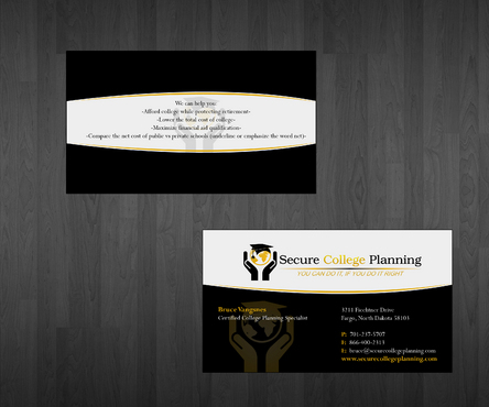 Creater, I like your design, on the backside, could you make the logo smaller, and the bullet points larger since those would be the most important. I would also like to see what the bullet points would look like in gold on the black background. Please review my comment about (underline or emphasize the word net) on the last bullet point, I don't want that on the card, it is instruction about the last bullet point.