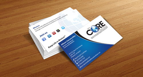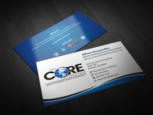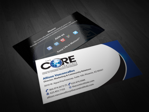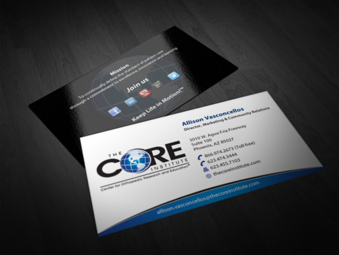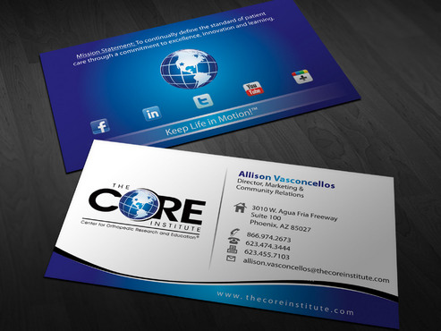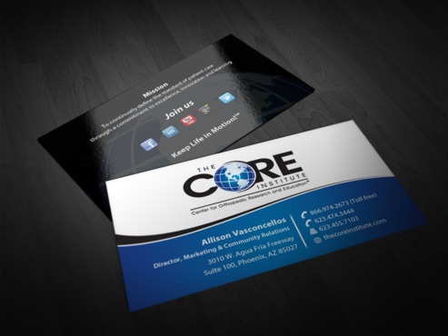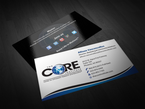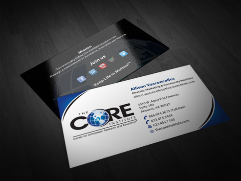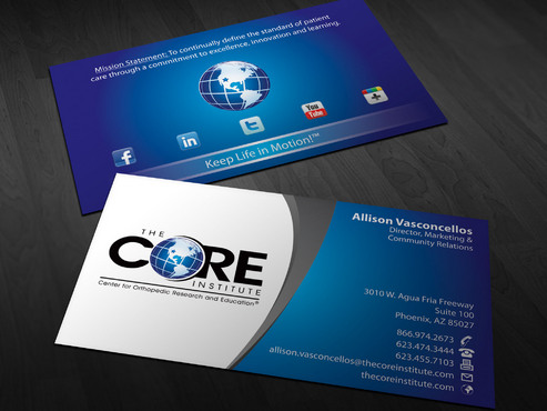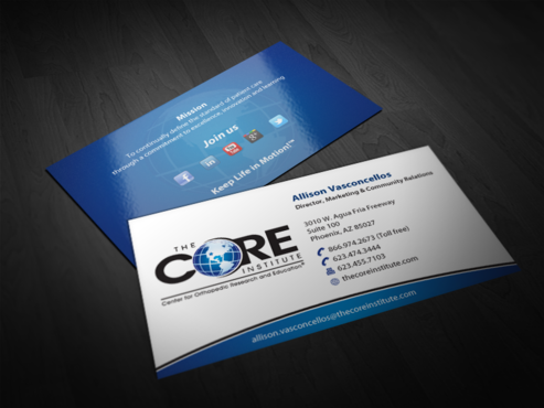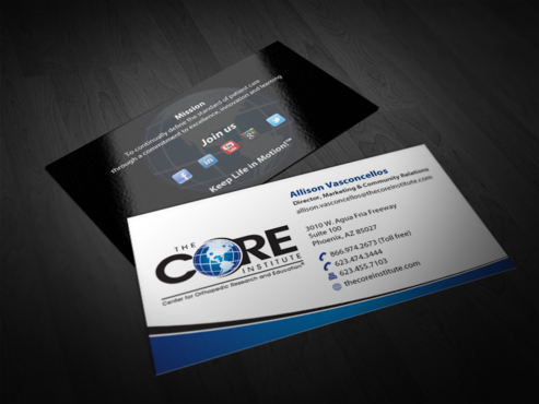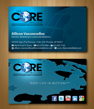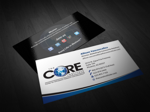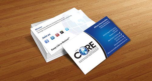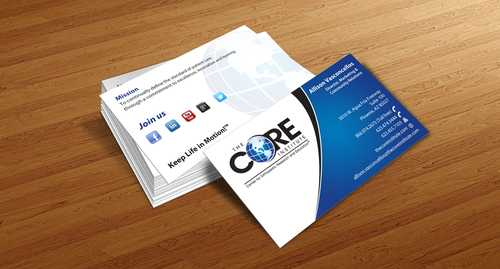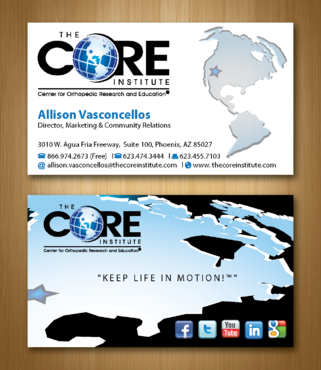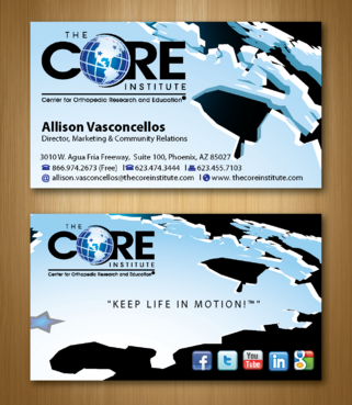 - When using the phone numbers, we use periods instead of dashes. - incorporate social media links (facebook, linkedin, twitter, you tube and google plus) -incorporate tag line "Keep Life in Motion!™" - cannot be curved corners, must be square edges - would like to see a simple abstract swoosh to create movement on the card