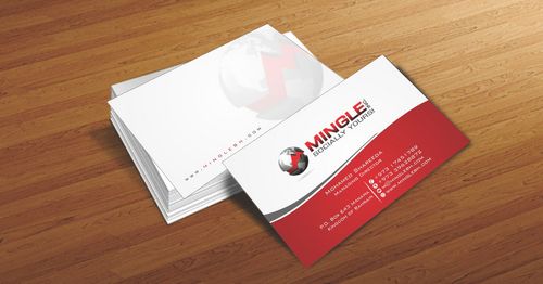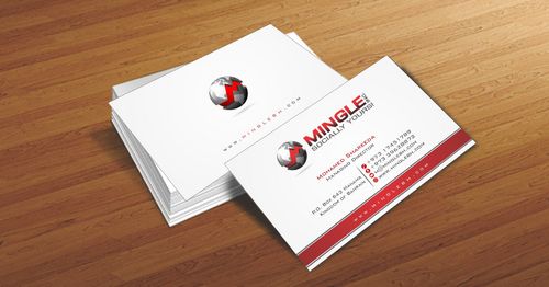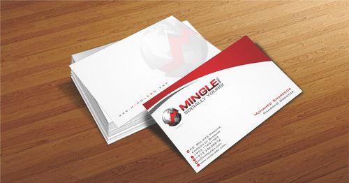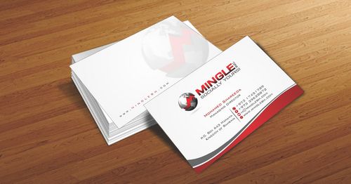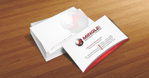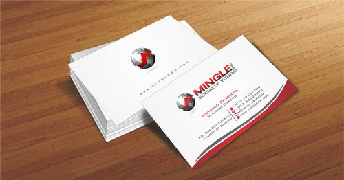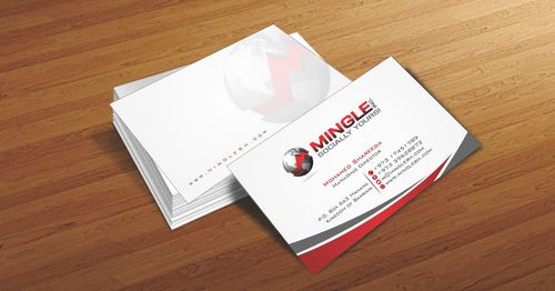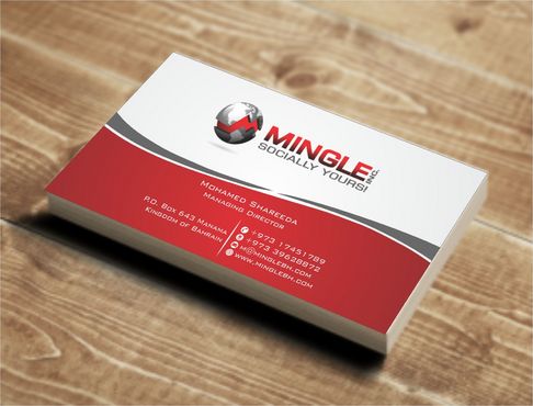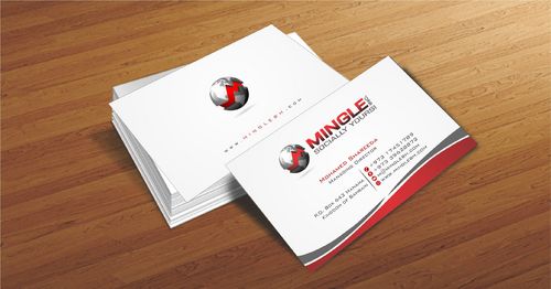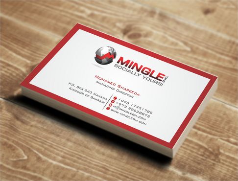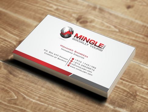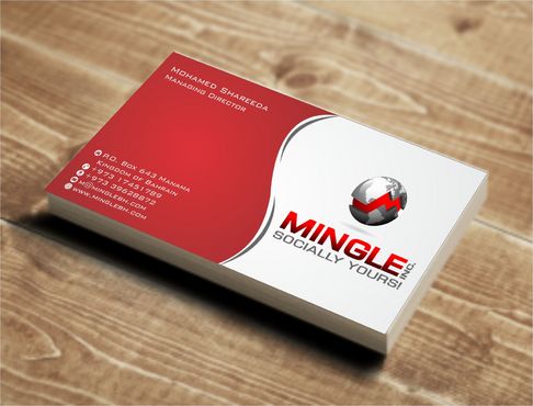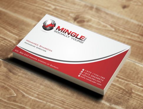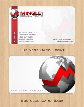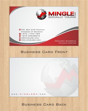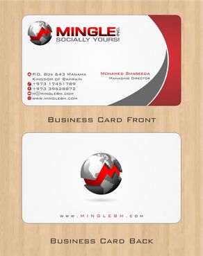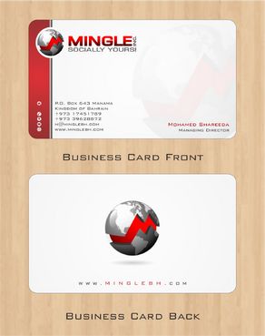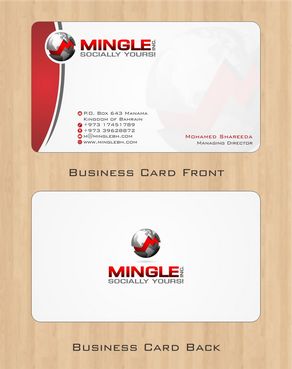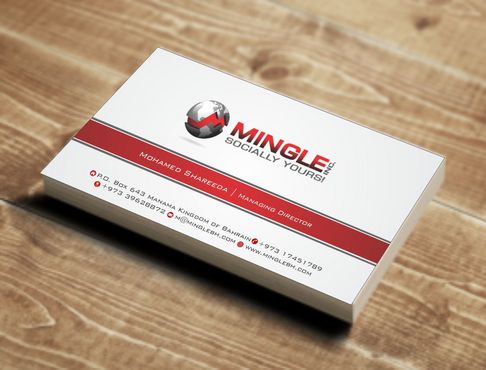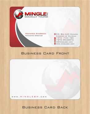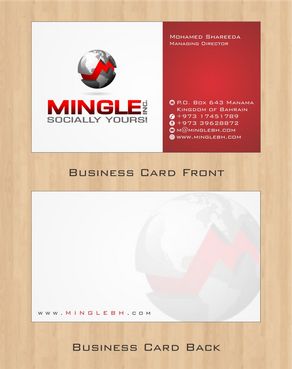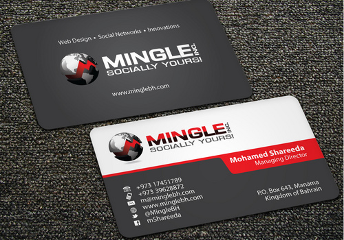 icons for phone & cell instead of text. add twitter icon with @MingleBH add skype icon with mShareeda the backside of the busniess card will have the logo and the website below it. and below those: Web Design | Social Networks | Innovations