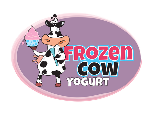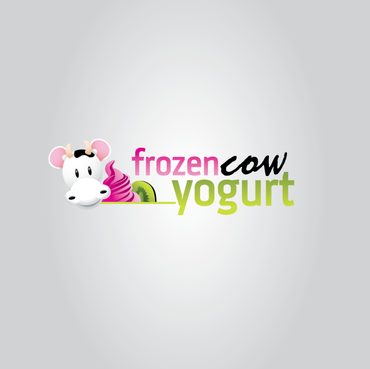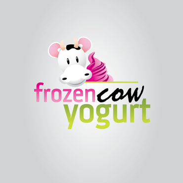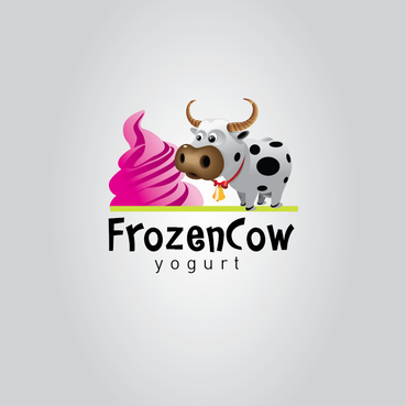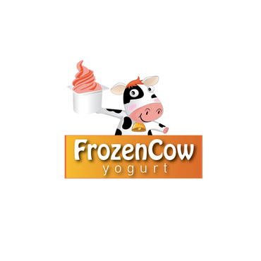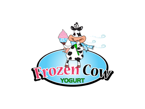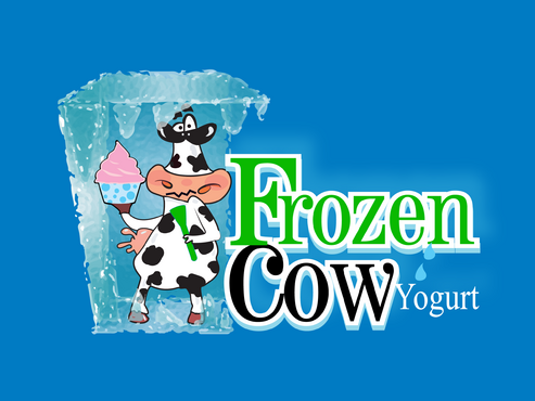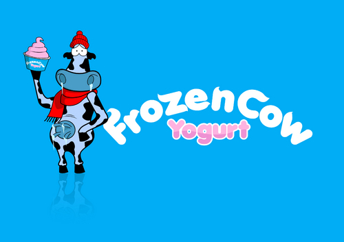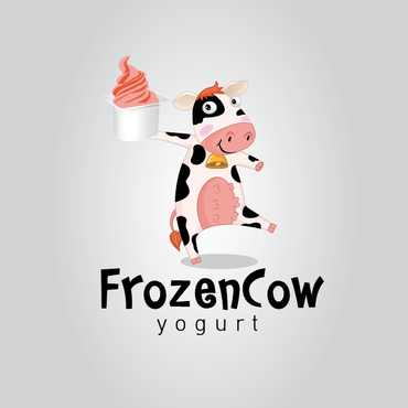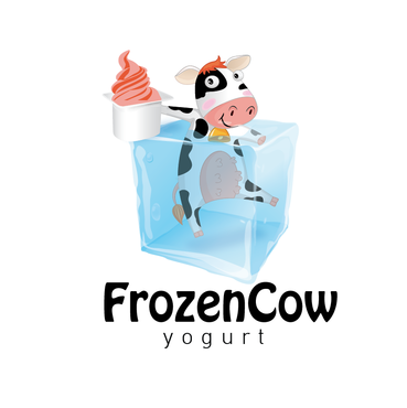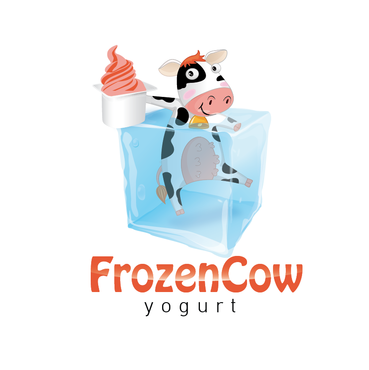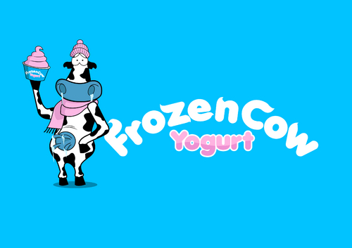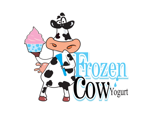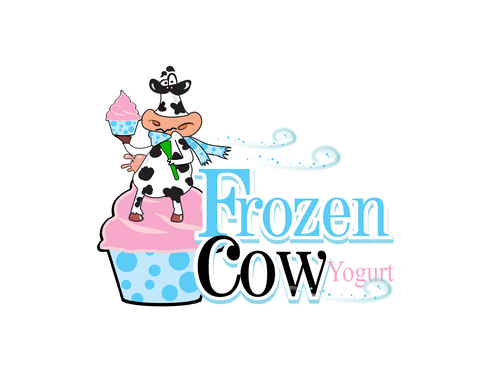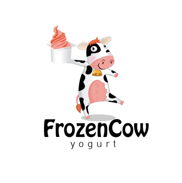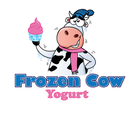 Im looking for a logo that will include the business name and a picture of a cow like one linked below. I would like it to be a cool and hip cow but she needs to look cold or freezing maybe a wearing a hat or scarf. Also holding a cup of frozen yogurt and maybe leaning on the words Frozen Cow Yogurt. I want the words Frozen Cow to be larger than the word yogurt. Maybe have yogurt under frozen cow.