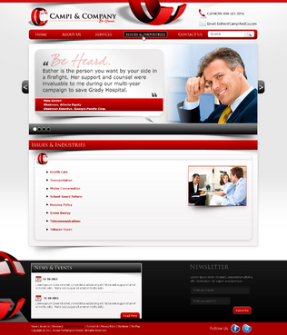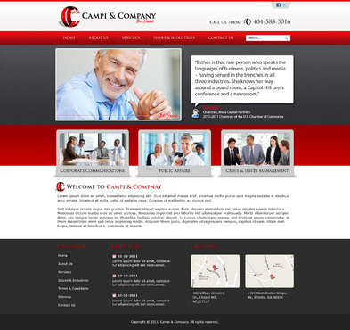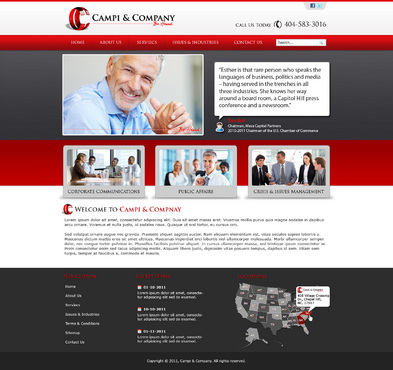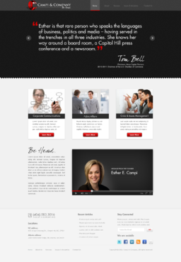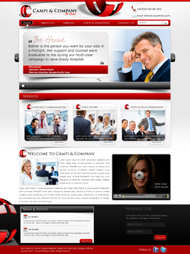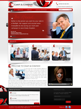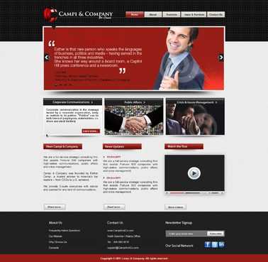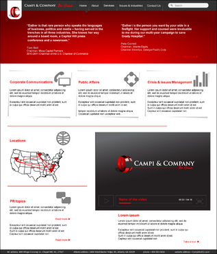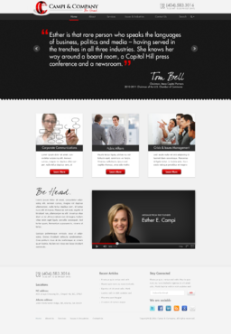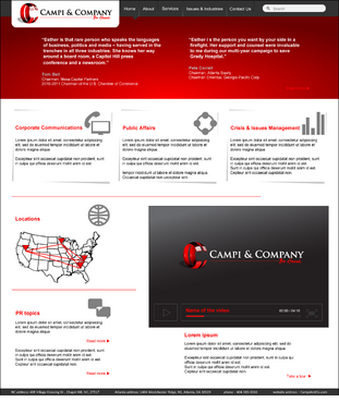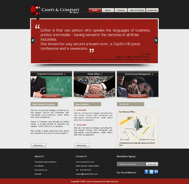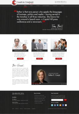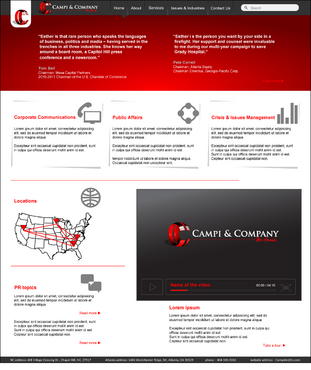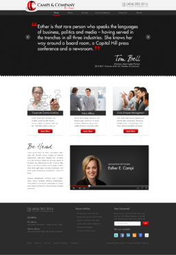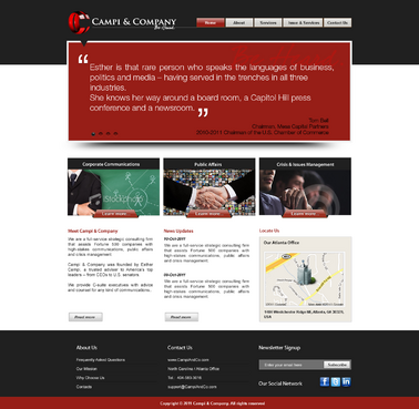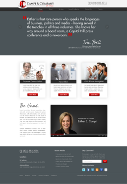 Our target audience is CEOs and other senior executives, so the look and feel must be ultra-professional, sophisticated, modern and fresh. We must have a clean design that inspires confidence that our firm can handle the most high-level strategic communications that affect Fortune 500 companies’ reputations. Trust and professionalism are key. Nothing cluttered or immature – but we’re not stodgy or old-fashioned, either. Just strategic, smart, trustworthy, clear and crisp. The design must not overpower the message of the website. IMPORTANT: The website elements should take into account that a significant group of potential clients will be accessing the site on their mobile devices. Mandatory elements: • company name: Campi & Company (use the ampersand, not the word “and”) • logo • tagline: “Be Heard. • website address – CampiAndCo.com • phone – 404-583-3016 • NC address: 408 Village Crossing Dr., Chapel Hill, NC, 27517 • Atlanta address: 1404 Westchester Ridge, NE, Atlanta, GA 30329 I am selling myself as an expert adviser to Fortune 500 companies that need help with high-stakes communications that can affect their companies’ reputations. Everything should be appropriate for this audience. Home Page Below are the major elements I need on the home page. Your challenge is how to smartly incorporate these things while maintaining a clean, easy site that is not cluttered. Home Page - Quotes A key feature of my home page should be prominently featured quotes from CEOs who have endorsed my work (we may later include their pictures). This “endorsement” feature might be the most important thing on my home page, so the page should be built with that in mind. I’ll leave it to you to figure out how to prominently and tastefully display these quotes on the home page – perhaps with giant quote marks and a scrolling bar. I need to be able to add more as I get them. And there are quite a few, so you’ll have to come up with a creative way to display these in rotation, but also make them readable on iPad and mobile devices. I’ll leave that to you. The quotes are at the bottom of this brief. AND IT IS QUITE POSSIBLE THAT THE WINNER OF THIS CONTEST WILL BE THE DESIGNER WHO COMES UP WITH THE BEST WAY TO FEATURE THESE QUOTES. Home Page - 3 Major Services You should also consider a way to cleanly display the 3 major services we offer (detailed below) on the home page, and perhaps make them clickable to the Services page. I tend to be a fan of web pages that have three easy “panes” on the home page for customers to choose from: • Corporate Communications • Public Affairs • Crisis & Issues Management Home Page - Tagline I would also like to incorporate our tagline on the home page: “Be Heard.” Home Page - Social Media I might also eventually add a blog, a Twitter feed, or a section that features hot PR topics in the news, so suggest ways to incorporate social media on the home page without it becoming too cluttered. Home Page - Map Our firm has two locations – North Carolina and Georgia. Please consider where to place an interactive U.S. map where people can click and see our addresses in GA and NC. 5 Landing Pages of Website I will need the following 5 sections on the nav bar, which open up into landing pages: 1 - Home 2 - About (landing page should include space for my photo and bio, as well as links to news articles about me) 3 - Services (I need to showcase three services: • Corporate Communications • Public Affairs • Crisis & Issues Management On the Services landing page, there should be room for a few sentences describing each service, and perhaps an image or photo for each. 4 – Issues & Industries (I need a clean, clever way to list the industries and issues where I have experience, and allow readers to click on topics of interest and read a short case study about my experience in that industry or with that issue. This list under case studies should include: • Advisor to CEOs (this link should then allow for additional sub-links under it to various case studies within this topic) • Health Care • Transportation • Water Conservation • School-Board Reform • Housing Policy • Green Energy • Telecommunications • Tobacco Taxes • Labor-Union Negotiations • College Sports 5 - Contact Us Must include a Web-based email that goes to: Esther@CampiAndCo.com Phone number: 404-583-3016 Quotes for Home Page Rick Smith Chairman and CEO, Equifax, Inc. “Esther has earned the respect of every CEO she has worked with in Atlanta.” Pete Correll Chairman, Atlanta Equity Chairman Emeritus, Georgia-Pacific Corp. “Esther is the person you want by your side in a firefight. Her support and counsel were invaluable to me during our multi-year campaign to save Grady Hospital.” Tom Bell Chairman, Mesa Capital Partners 2010-2011 Chairman of the U.S. Chamber of Commerce “Esther is that rare person who speaks the languages of business, politics and media – having served in the trenches in all three industries. She knows her way around a board room, a Capitol Hill press conference and a newsroom.” Bill Linginfelter Area President, Georgia/South Carolina, Regions Bank “Before you step on stage for a major speech or face the cameras for a high-profile issue campaign, Esther is the person you want as your adviser. I worked directly with her on issues ranging from transportation to education to economic development. She’s a pro.” Neely Young Publisher & Editor in Chief, Georgia Trend Magazine “Esther Campi appreciates the role of the press in the business arena. … She is known all over Georgia as a person that is well respected by media veterans for knowing how to work effectively with us.” Sam A. Williams President, Metro Atlanta Chamber “In her tenure at MAC, Esther managed high-stakes, front-page civic issue campaigns like saving Grady Hospital, sharing good news about the tens of thousands of jobs MAC has recruited to Atlanta