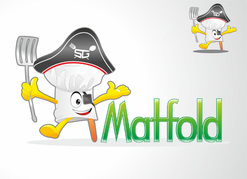 If he can be incorporated in the "text logo "Matfold" as say the "o", that can be an idea. Green, red and yellow are a good colors.