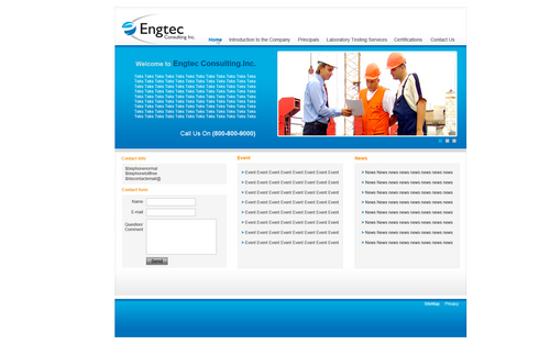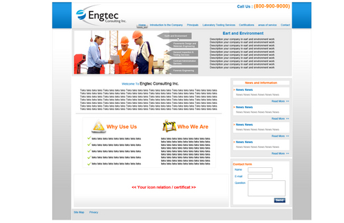 Engtec Consulting Inc. is a Civil Engineering Consulting Firm based out of Toronto that specializes in: 1. Earth and Environment (also called Geotechnical and Environmental Engineering); 2. Pavements Design and Materials Engineering 3. General Inspection & Testing Services 4. Contract Administration Services 5. Forensic Engineering This website should have the following sub-pages 1. Introduction to the Company 2. Principals 3. Laboratory Testing Services 4. Certifications 5. Disciplines (or areas of service) 6. Contact