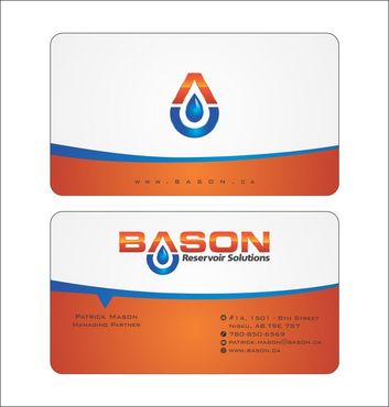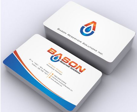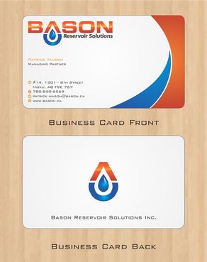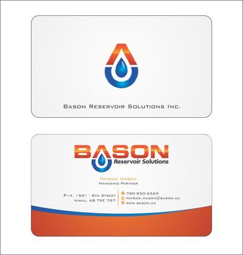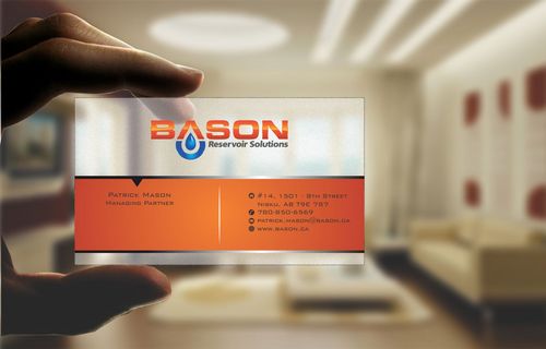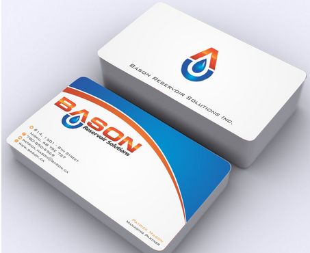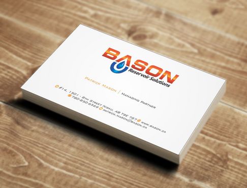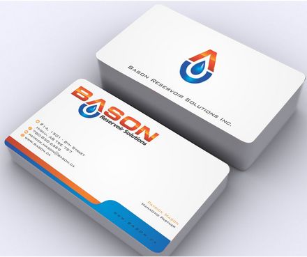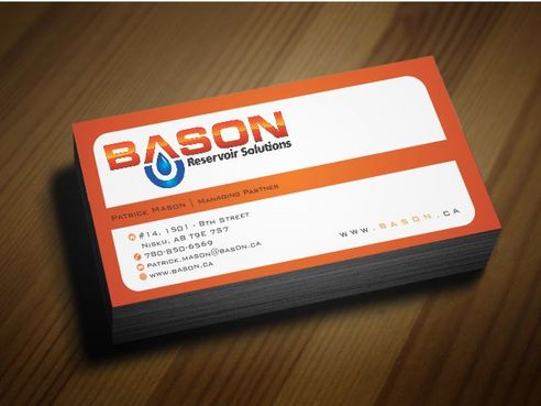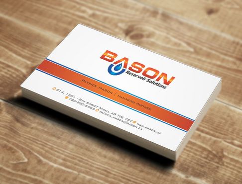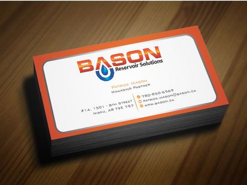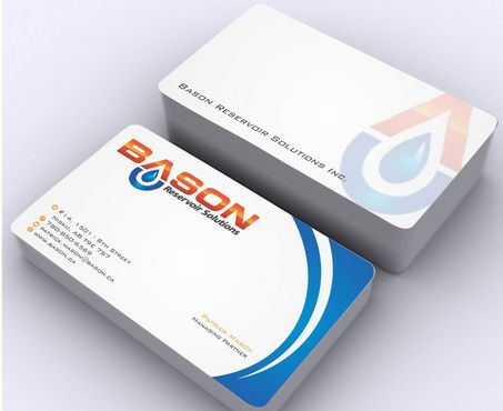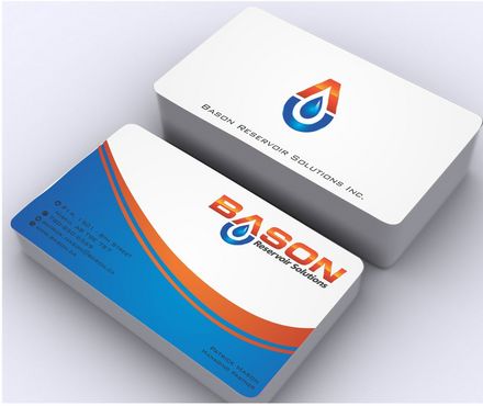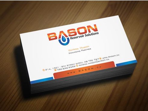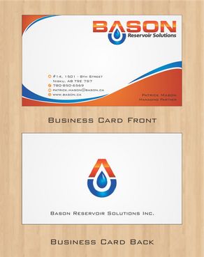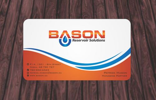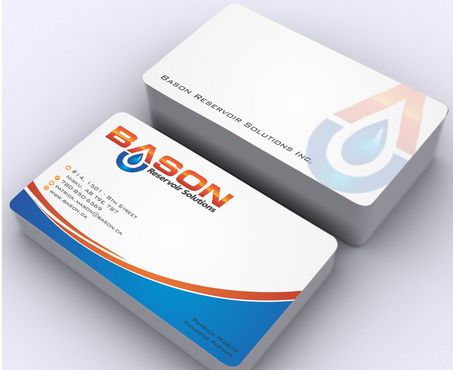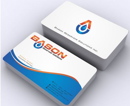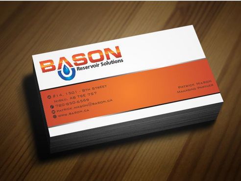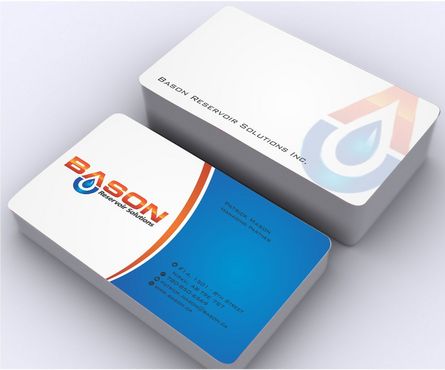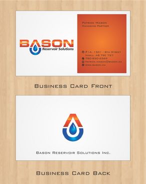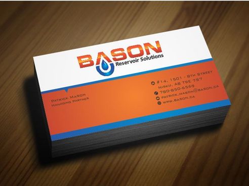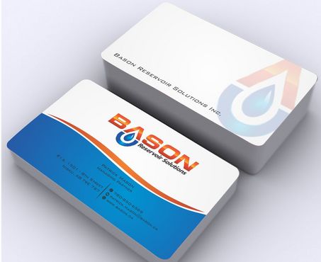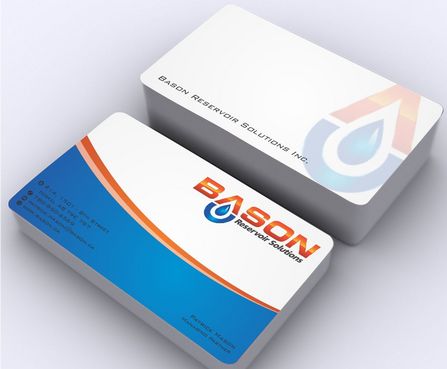 Back of business card we would like to see the Bason logo on a black back ground (but are open to other suggestions) Centered on the back bottom part of card it should state: "Bason Reservoir Solutions Inc."