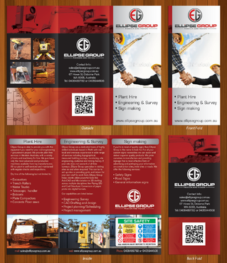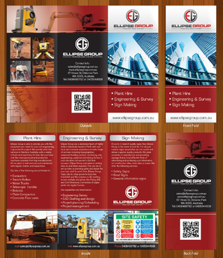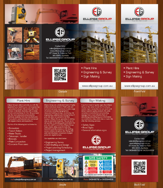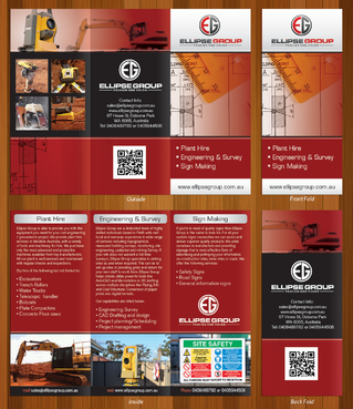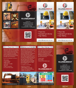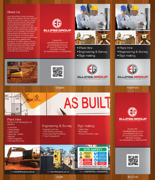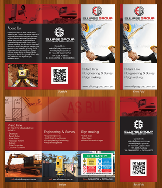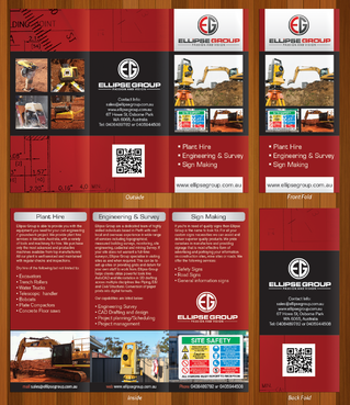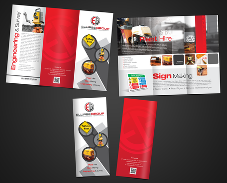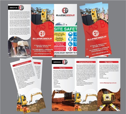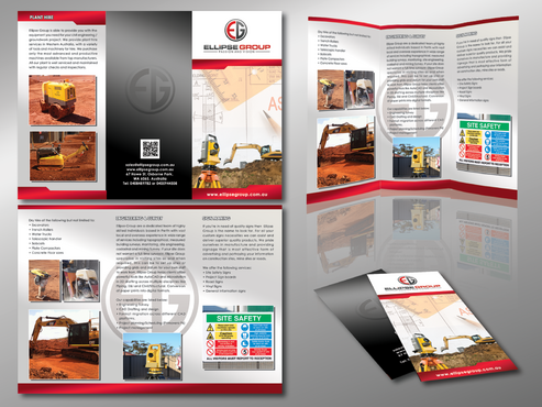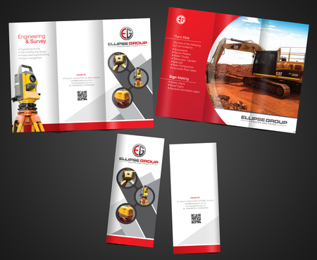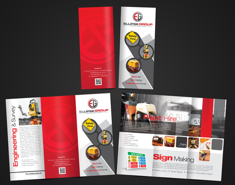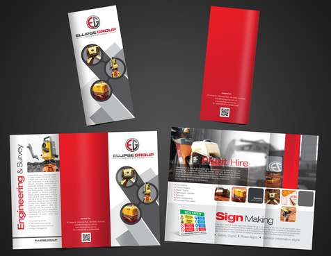 The goal is to remain consistent with corporate colours- red, black, gray/ silver and white. Background of brochure in a darker colour such as black, dark gray, gray, silver or white. Would like the front of the brochure to be eye catching, highlighting our 3 main areas of work – Plant hire, Sign making and Engineering & Survey.