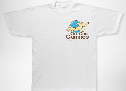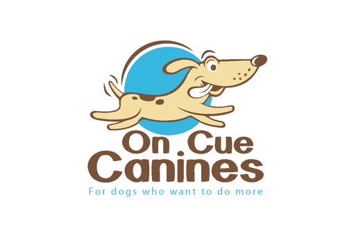 On Cue in an arc over a dog jumping over the word Canines at the bottom.