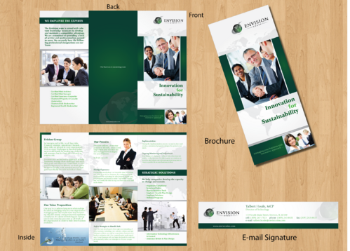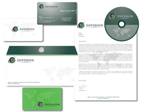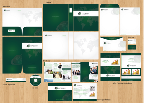 In addition to branding our business cards, we're also looking to brand: 1) folders - two pockets w/ a slotted area on the left pocket to insert a business card 2) brochures - 8.5"x11" tri-fold brochure 3) letterhead 4) envelopes 5) sales proposal cover letter - Our logo and name - Presented to: "Customer's name" - Presented by: "our sales person(s)" - Title of presentation - our web address 6) powerpoint 7) binders (including spline) 8) cd label - Company's name we're presenting cd to - our logo and name - title of content on cd