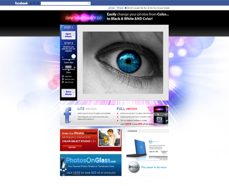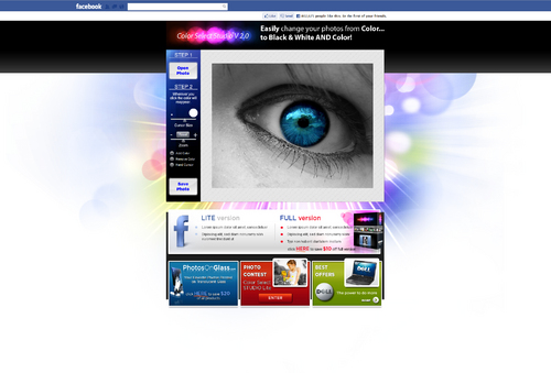 The link to the live app is provided in the referred websites section. Also, see our main website www.magicsplash.com for reference. Starting with the canvas area (diagonal lines) and build from there. The canvas is 640x530. We will provide the logo to incorporate above the canvas and control section. The tagline is "Easily change your photos from Color... to Black & White AND Color!" Below the app we need the following sections: A chart comparing features / benefits of this version and the full version. Has a click here to save $10 off full version An area to advertise the website PhotosOnGlass.com with a click here to save 20% off all products. An area to place a banner ad of general size that will rotate different banners. An area to pitch the photo contest that users can enter when they edit their photos in Color Select Studio Lite.