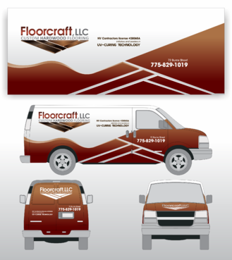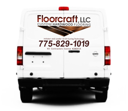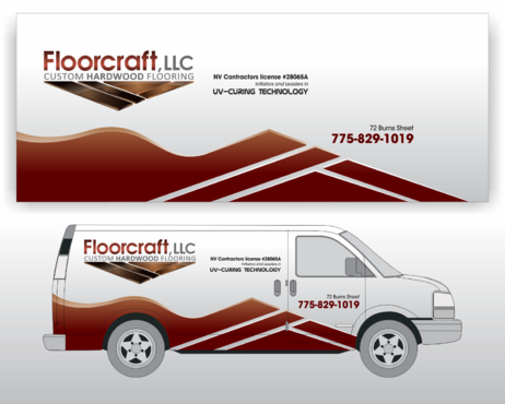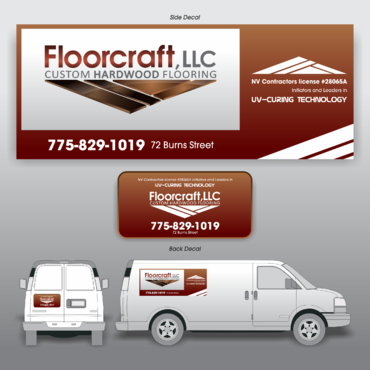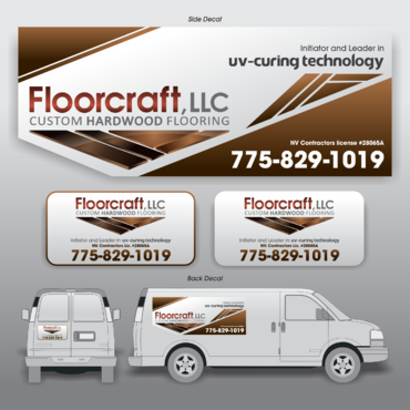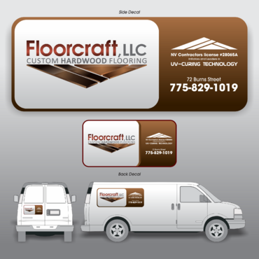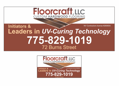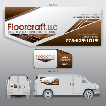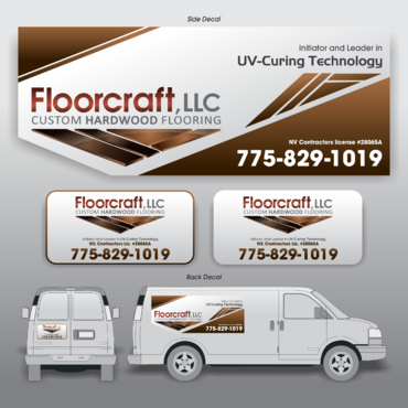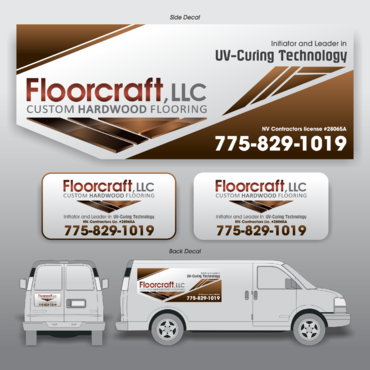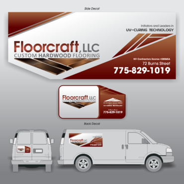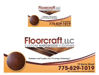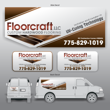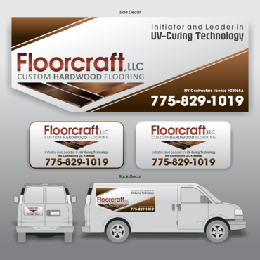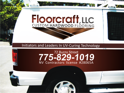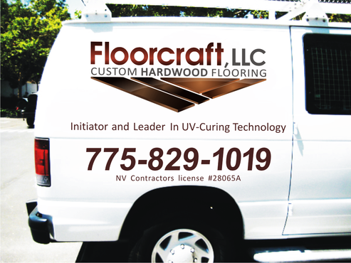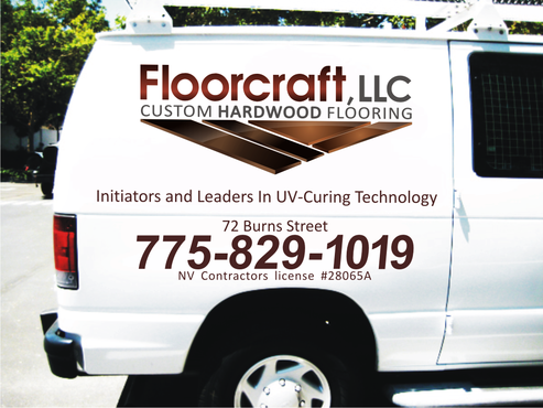 (1) Floorcraft LLC Hardwood Flooring (2) 72 Burns Street (smaller font for van decals) (3) 775-829-1019 (larger font for van decals) (4) NV Contractors license #28065A (smaller font for van decals) (5) Must have the words "Initiators and Leaders in UV-Curing Technology". Would like to see a technological edge on the UV-curing aspect.