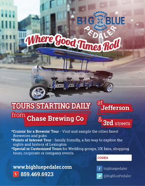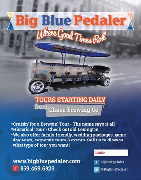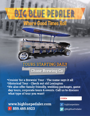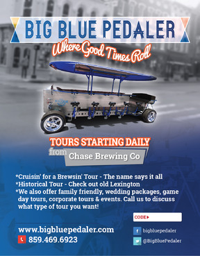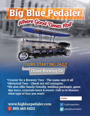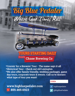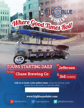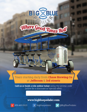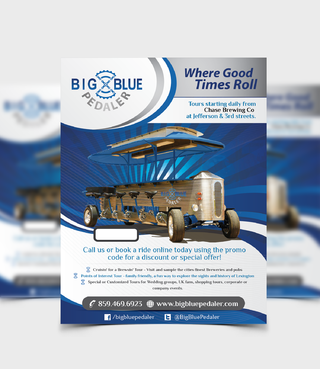 We are a pedal trolley company just opening. We just want a one page, fully color design to fit a 5.47x4.21 sized card. Please take creative liberties to spice it up. I will be uploading pictures of what our bike looks like. Also see attachments for our logo files etc. Our website is www.bigbluepedaler.com, our facebook is www.facebook.com/bigbluepedaler and our phone number is 859.469.6923 and we operate out of Lexington, KY if you want to research us and the area for additional inspiration. Also include our phone number, website, facebook and @BigBluePedaler twitter info. Please include the text: "Call us or book a ride online today using the promo code below for a discount or special offer!" and leave a white box for the "Promo code" that we can write in. Also include "Tours starting daily from Chase Brewing Co at Jefferson & 3rd streets."