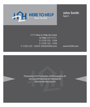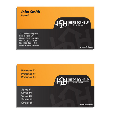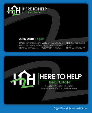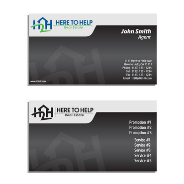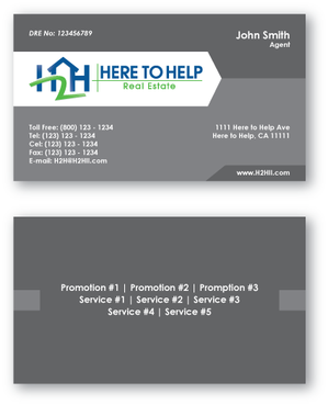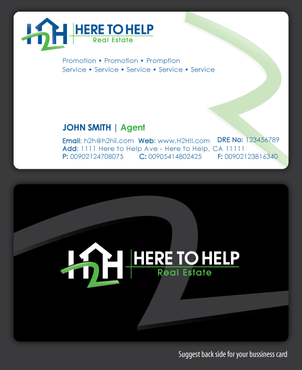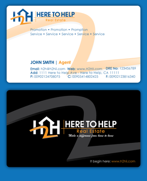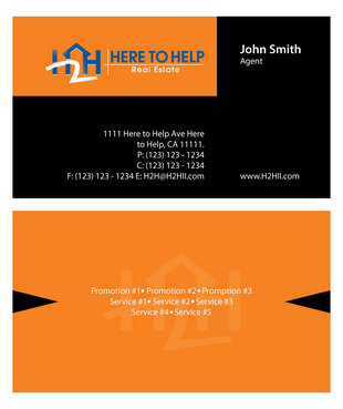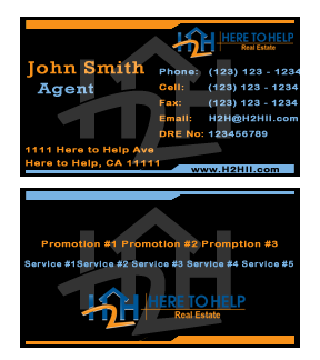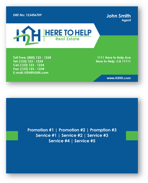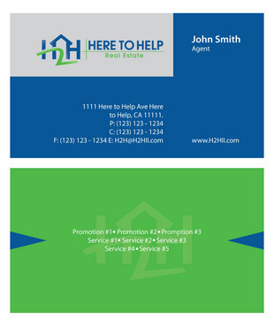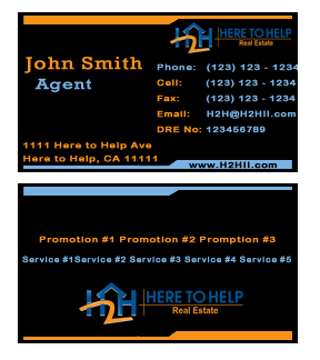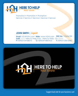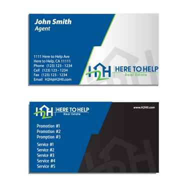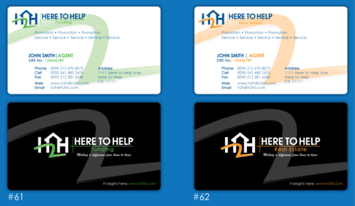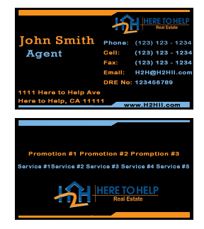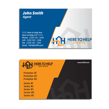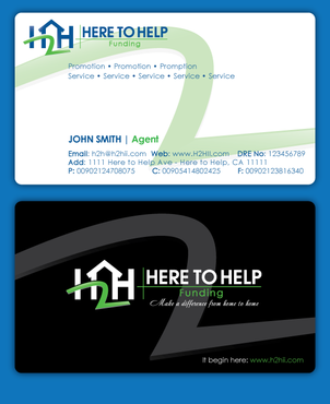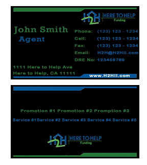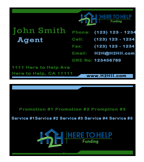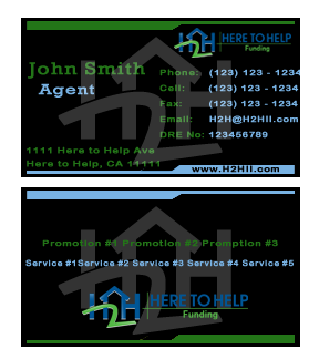 This company have 2 entities: Here to Help Real Estate (H2H RE) and Here to Help Funding (H2H F). The color for H2H RE is blue/green and H2H F is blue/orange. There is going to be 2 business card with same design but with different color theme. Please have the design include the image of the real estate agent in the front of the business card. When turn final version please have it in Adobe Photoshop with multi layer in it and image in png/gif/tif. Thank you.
