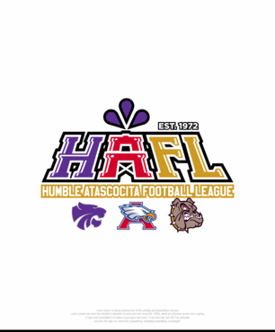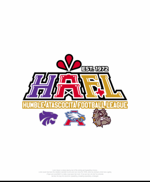 We would like it to include the mascot logos to use on the web, signs, and print. We would also like to have an acronym version of the logo just HAFL with the same concept for shirts and embroidery. I have included a few examples of simple print logos for Katy, SCFL, and KFL and it must include EST. 1972.