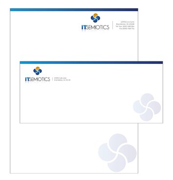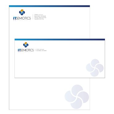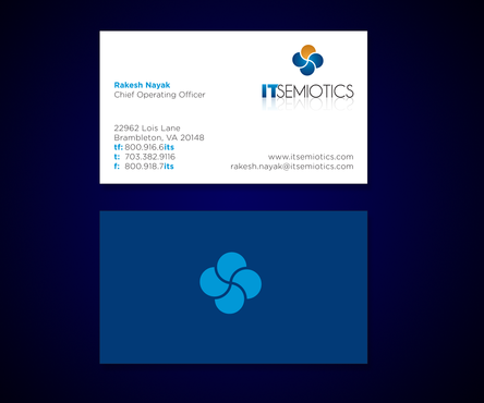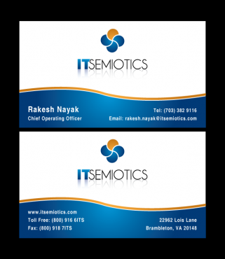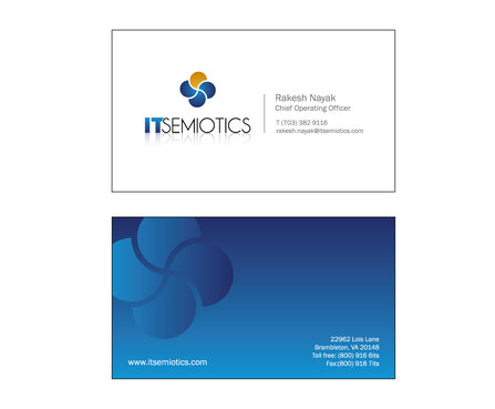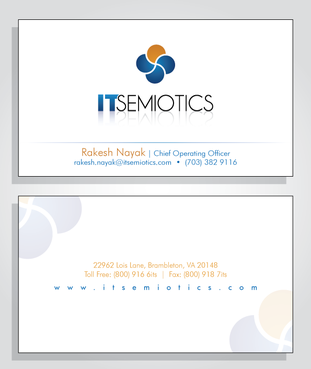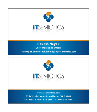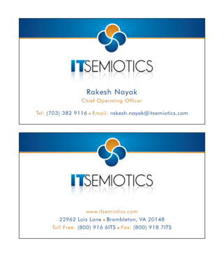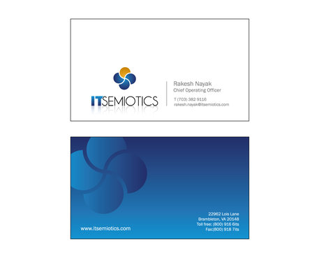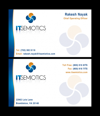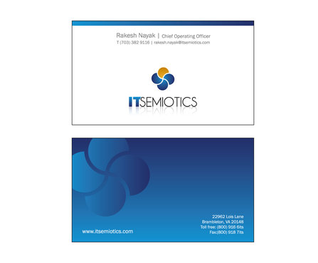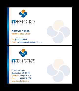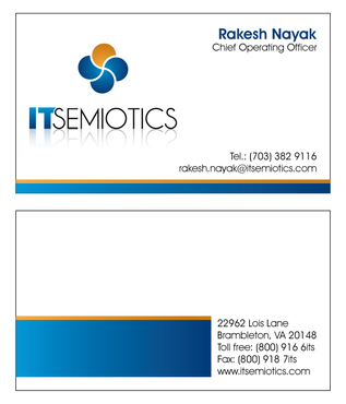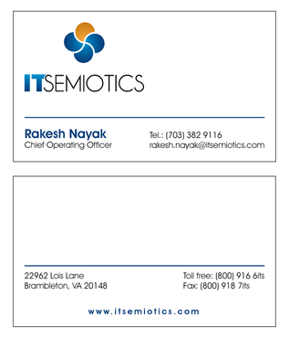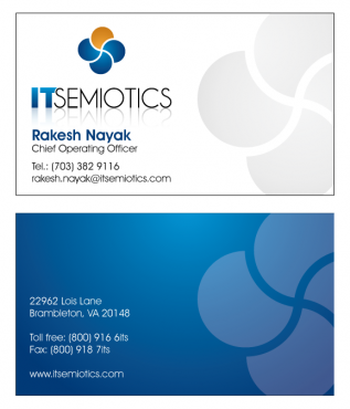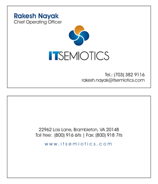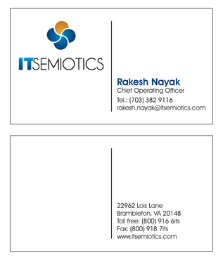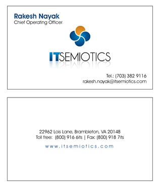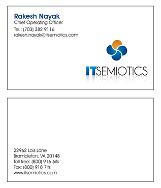 Front side: Rakesh Nayak Chief Operating Officer t (703) 382 9116 rakesh.nayak@itsemiotics.com Back Side: www.itsemiotics.com 22962 Lois Lane Brambleton, VA 20148 Toll free: t (800) 916 6its, f (800) 918 7its The key word is "CLEAN" and "Unique". If watermark, it should be really light. Normal edges. Pick the fonts and colors of your choice that will go with the logo. You can always try to keep all information on front but I want to keep the front of the business card as clean as possible with all "most used" information. The logo should be of focus. Same rule applies to letter head and envelopes. Also, need design for "thank you" cards and brochure. Good luck.