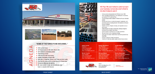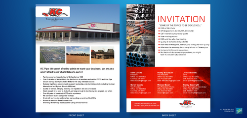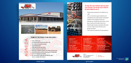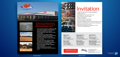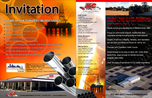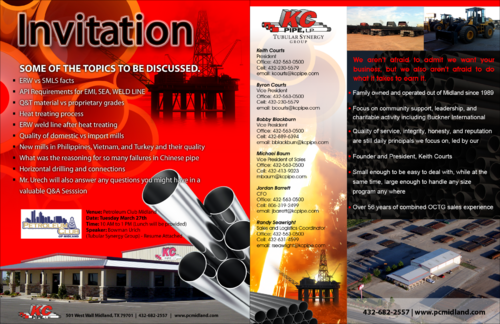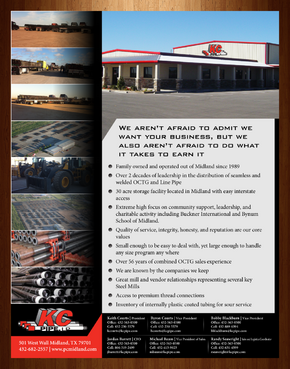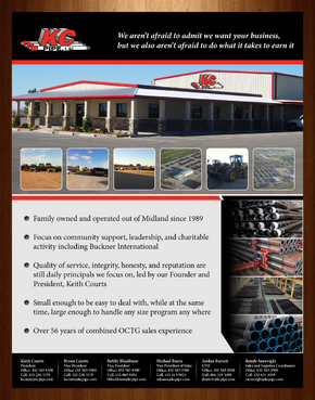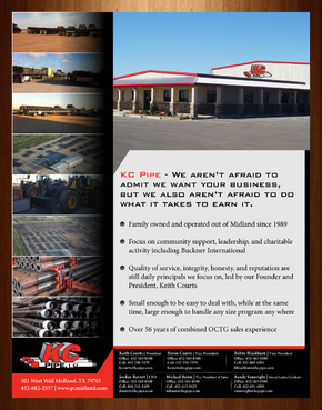 KC Pipe- We aren’t afraid to admit we want your business, but we also aren’t afraid to do what it takes to earn it - Family owned and operated out of Midland since 1989 - Over 2 decades of leadership in the distribution of seamless and welded OCTG and Line Pipe - 30 acre storage facility located in Midland with easy interstate access - Extreme high focus on community support, leadership, and charitable activity including Buckner International and Bynum School of Midland. - Quality of service, integrity, honesty, and reputation are our core values - Small enough to be easy to deal with, yet large enough to handle any size program any where - Over 56 years of combined OCTG sales experience - We are known by the companies we keep - Great mill and vendor relationships representing several key Steel Mills - Access to premium thread connections - Inventory of internally plastic coated tubing for sour service - At the bottom contact information with titles... Keith Courts President Office: 432-563-0500 Cell: 432-230-5579 email: kcourts@kcpipe.com Byron Courts Vice President Office: 432-563-0500 Cell: 432-230-5579 email: bcourts@kcpipe.com Bobby Blackburn Vice President Office: 432-563-0500 Cell: 432-889-6394 email: bblackburn@kcpipe.com Michael Baum Vice President of Sales Office: 432-563-0500 Cell: 432-413-9023 mbaum@kcpipe.com Jordan Barrett CFO Office: 432-563-0500 Cell: 806-319-2499 email: jbarrett@kcpipe.com Randy Seawright Sales and Logistics Coordinator Office: 432-563-0500 Cell: 432-631-4599 email: rseawright@kcpipe.com