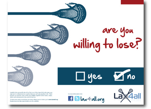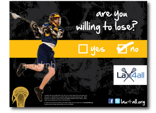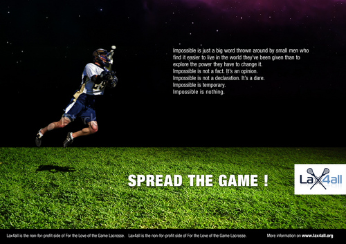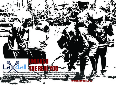 This magazine ad is about our non-for-profit organization Lax4all. We want this Lax4all ad to go along with our "Goal" Campaign. The first 2 ads from this campaign are attached. Lax4all is an organization that spreads the game of lacrosse throughout Long Island, NY to underprivileged areas that don't have the sport of lacrosse. Lax4all is a growing project and is always welcoming to those who are willing to help spread the game of lacrosse.