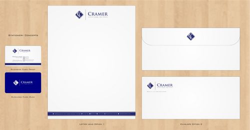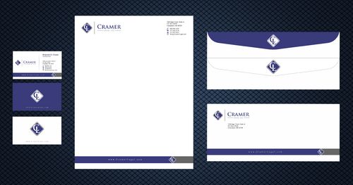 Please create business card, letterhead, and envelope designs. Focus on clean, professional design for this corporate law firm. Stay away from watermarks, waves, or anything that is too ink-intensive. You may use either or both of the attached logos.