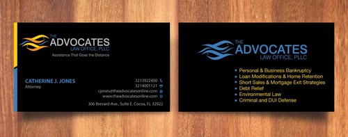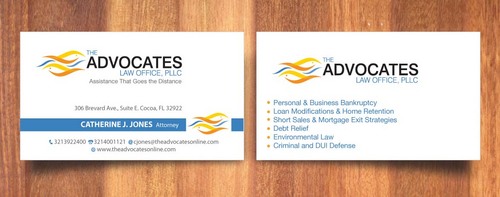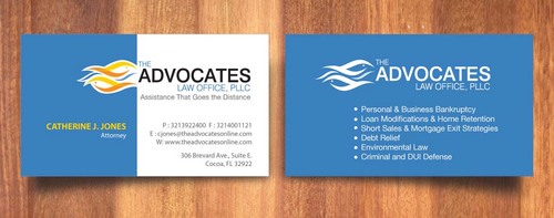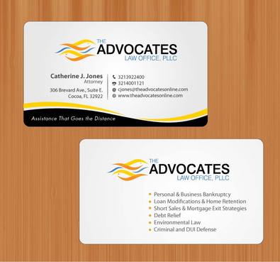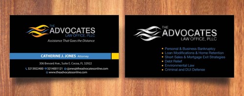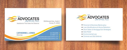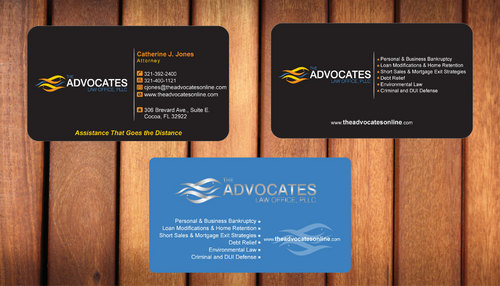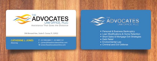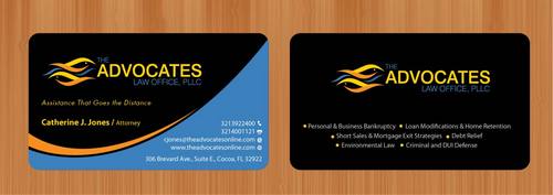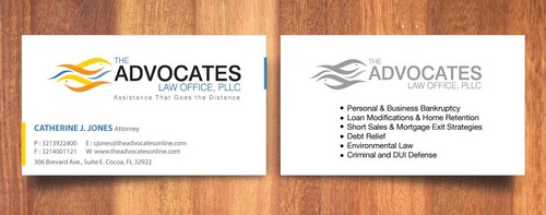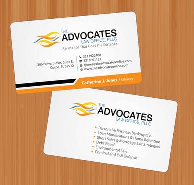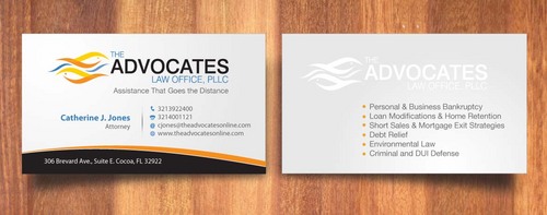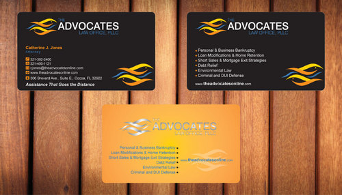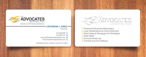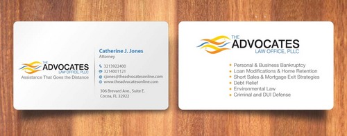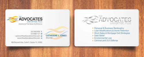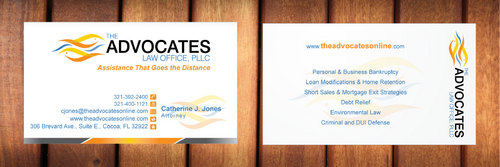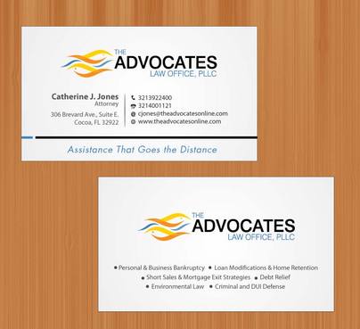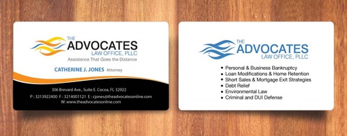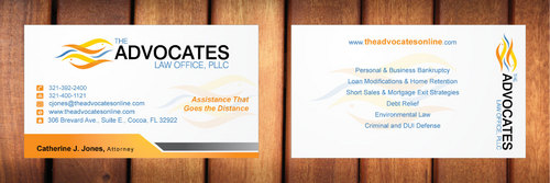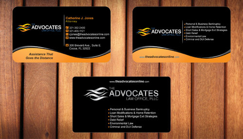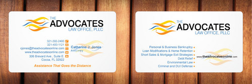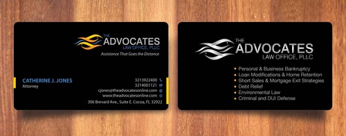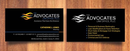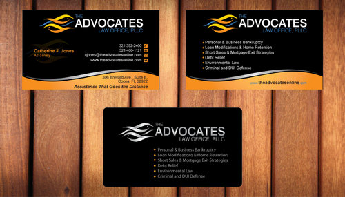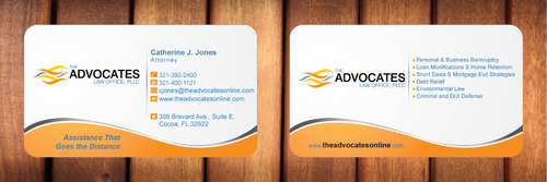 cardstock to be either black or bright white with silk coating and spot UV; tagline: Assistance That Goes the Distance; Offices: Orlando & Cocoa; new website look to be launched within next 30 days: http://design.cert-lawlinks.com/wp-content/themes/design/html/shane/Advocates_Law_Office/hp02.html