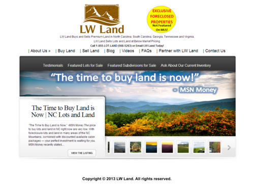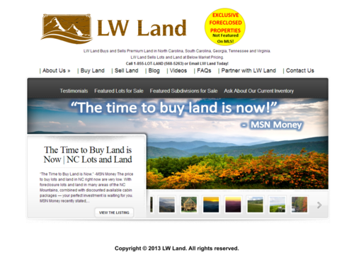 My company buys and sells destination land. Mainly we sell mountain and waterfront properties. Mountain lots with views over the Appalachian Trail. Ocean, lake and river front lots. Right now 80% of business in mountain property in NC and Georgia. Check us out at www.buylotsandland.com. We get our land cheap from the banks and sell it to the public at a reduced price due to market conditions. I envision a logo oval in shape. I like earth tone colors and a vintage, antique look. However, I look forward to seeing creative ideas. I would like something that could easily be used on our apparrel (golf shirts, columbia shirts, hats, etc.)