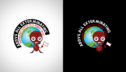 as a reminder the company is ABOVE ALL EXTERMINATING with the tag text "taking pest control to a higher level" so thats why the globe is a must. now the logo that i have has a man with like the world or globe on his soulder. would like to keep the concept but change the man to a animated character that will be my mascot for the company his name is Rocky. I can't use a still looking insect as a mascot.Thanks guys you are doing a great job.