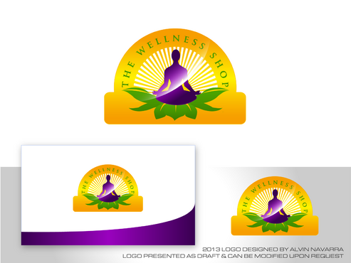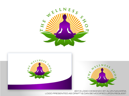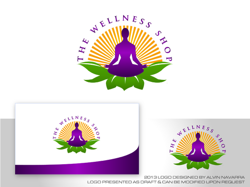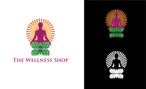 We would like the logo to be the silhouette of a meditating figure seated on a stylized lotus flower, in front of a sunburst pattern.