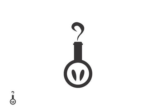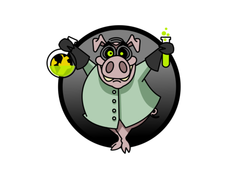 The pig should look like a mad scientist, standing on its hind legs, wearing goggles and holding test tubes. The pig appears to be pouring the contents of those test tubes into a flask.