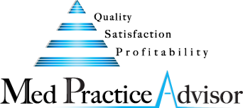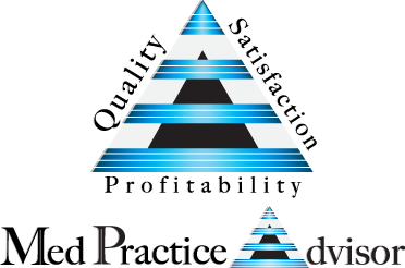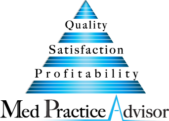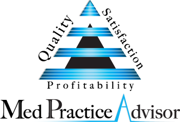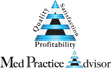 Logo for MedPracticeAdvisor and symbol (triangle?) & terms "quality, satisfaction, profitability"