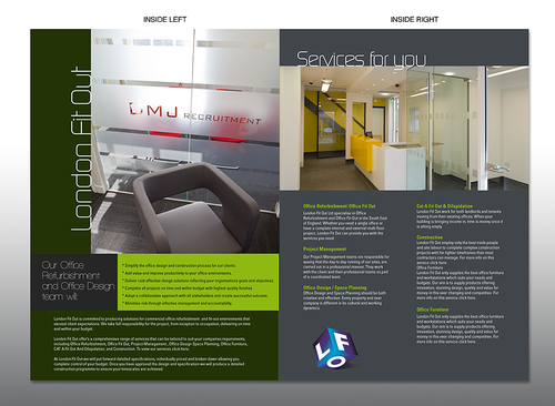 I need a 4 page A4 company brochure, which has the flare of interior office design, office refurbishment & fit out specialist, modern feel with a wow factor! I am looking for office images, office furniture etc.. also a London Skyline back drop would be very good, it needs to have the feel of an interiors designers / office fit out contractor / office furniture provider. Please see my website www.londonfitout.com to understand the concept of what our company offers. Services we offer gives a great idea of wording.