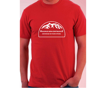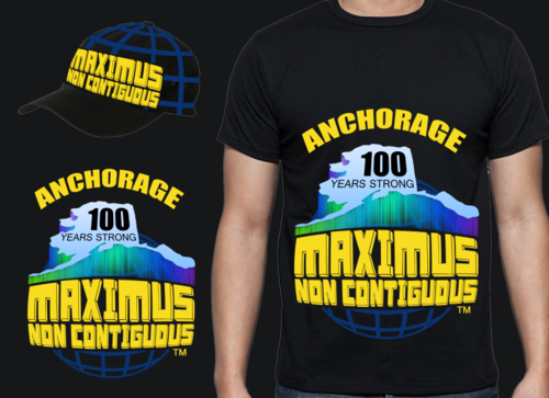 Design shape must fit well on the front or back of a T-shirt. Incorporate the phrase "MAXIMUS NON-CONTIGUOUS" with some sort of artistic rendering of the state of Alaska. Incorporate a small trademark marking "TM" somewhere near the MAXIMUS NON-CONTIGUOUS. Portray the unique status of Alaska as the largest, not-connected state. Incorporate the phrase "Anchorage 100 Years Strong" in smaller, more subdued text below the main design. The design colors should pop on a black T-shirt and be vivid on other colored shirts as well. I envision the design as modern and edgy.