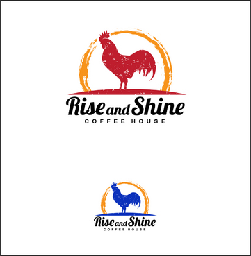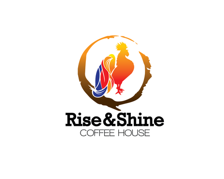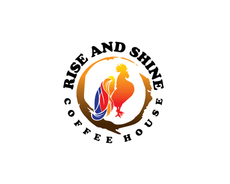 I would like a rooster that is framed by a coffee "stain" ring. I want the coffee ring to represent the sun rising. The rooster should be modernized, in modern colors (e.g. cobalt blue instead of navy blue) but still keeping with the country style (look) of a rooster. I would also like the rooster or just somewhere in the logo to have some sort of lime green accents, as the lime green and browns are our main colors.