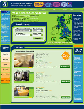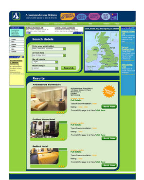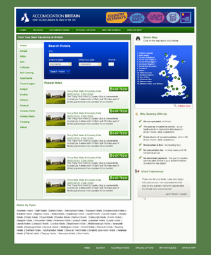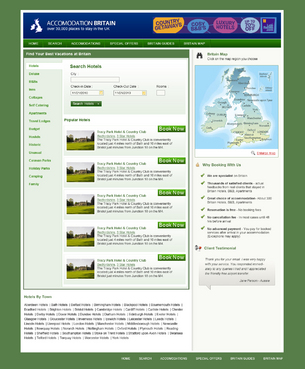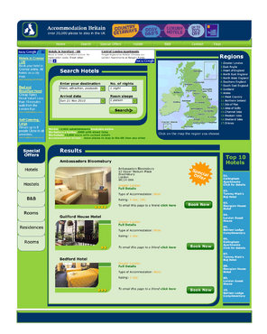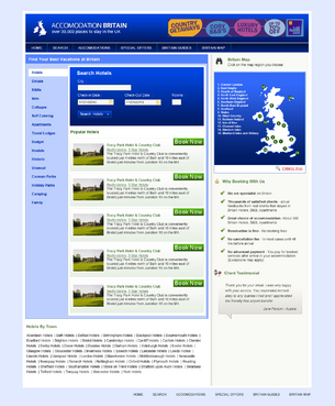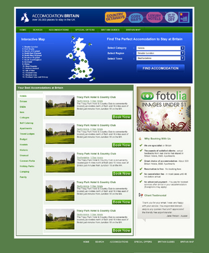 We are certainly NOT looking for a cut and paste job on the above websites! They are listed to give you an idea of the features we want to see on the page, we need to finish up with a page that is clean, attractive, and not confusing to the visitor. There need to be room for the current ads, and the home page will carry a uk map, but about 30% of the size of the current one. Green and blue for basic page colours.. There will be a photo on the homepage... probably an example of a hotel on site - eg http://www.accommodationbritain.co.uk/places/307.html Existing site: accommodationbritain.co.uk