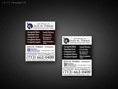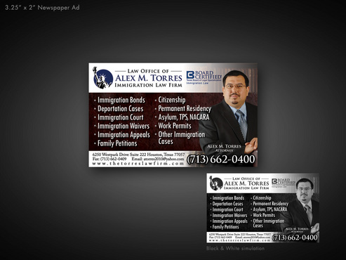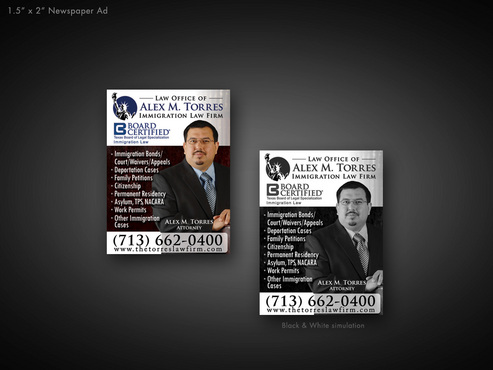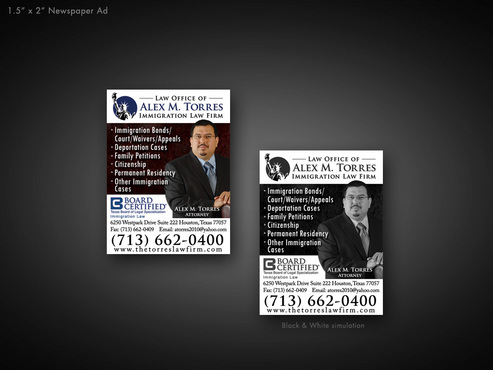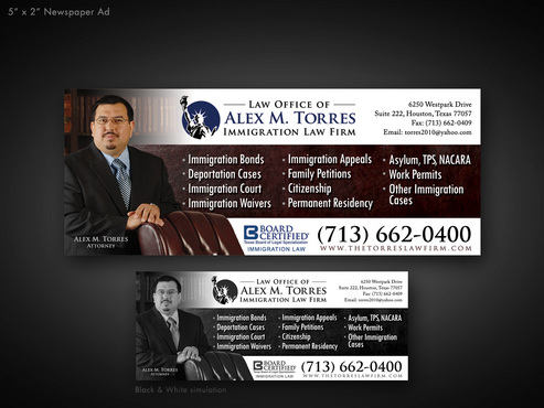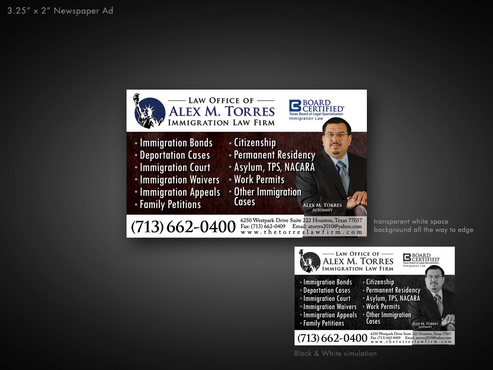 The following must be included: I will also upload my picture, my logo, and Board Certified Logo. Thanks. 1. Picture of Attorney 2. Attorney 3. Alex M. Torres 4. Law Firm logo 5. Board Certified Logo 6. Immigration Law below Board Certified Logo 7. 6250 Westpark Drive 8. Suite 222 9. Houston, Texas 77057 10. www.thetorreslawfirm.com 11. Telephone: (713) 662-0400 12. Fax: (713) 662-0409 13. atorres2010@yahoo.com 14. Immigration Bonds 15. Deportation Cases 16. Immigration Court 17. Immigration Waivers 18. Immigration Appeals 19. Family Petitions 20. Citizenship 21. Permanent Residency 22. Asylum, TPS, NACARA 23. Work Permits 24. Other Immigration Cases