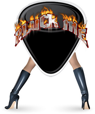 The idea being the flying v guitar is lying seductively waiting to be "plucked" by the plectrum.