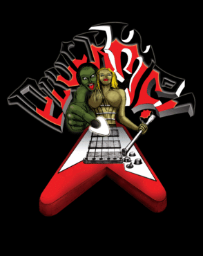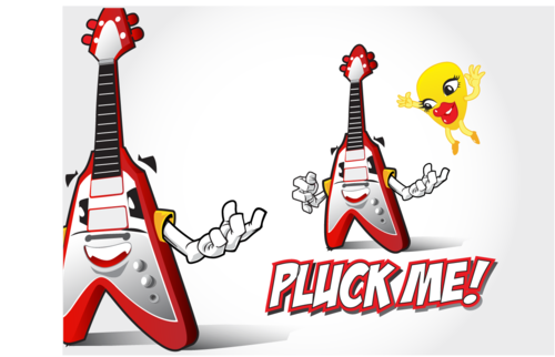 A cartoon character flying V guitar and a cartoon plectrum.