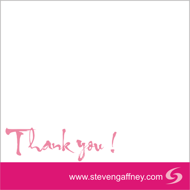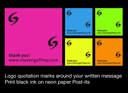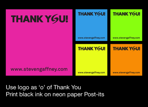 3inch by 3 inch post it size. Use your creativity to the fullest but handwritten notes must legible on post-it. White backgrounds are okay as long as message stands out. Color preference of background - hot pink, orange, neon blue, neon green The words "Thank You" and company website (www.stevengaffney.com) must be included on actual post it.