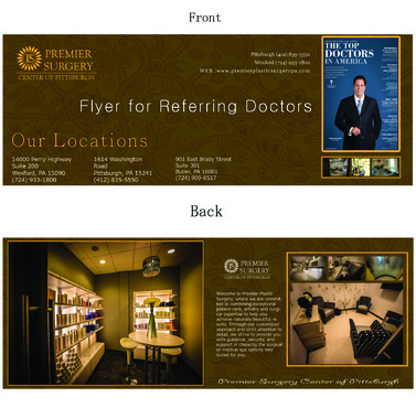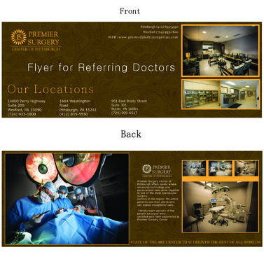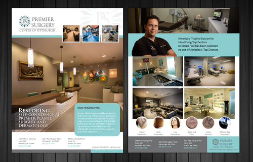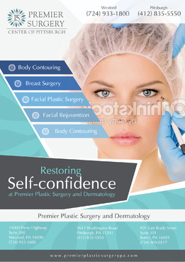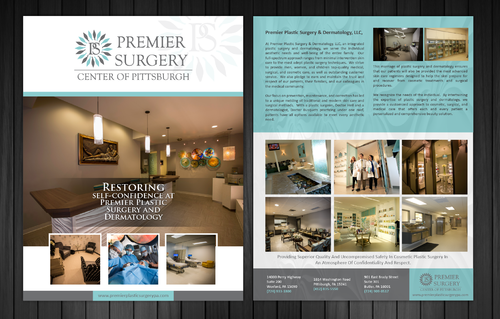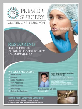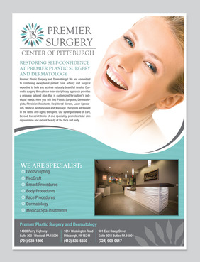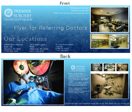 Flyer should have a great modern and crisp image. Clean. Please refer to our website: premierplasticsurgerypa.com. I would like to use the images of our office (I can upload these images for your development.). I want a soft, modern, and creative design on the flyer . The patients need a quick beautiful reference of where they are going to surgery. We provide them a seperate packet on all the details. This should be the awe factor flyer.