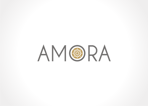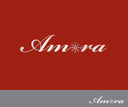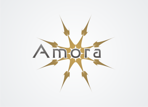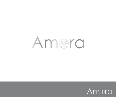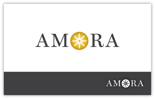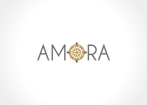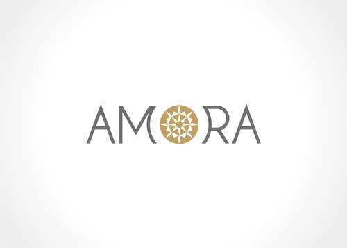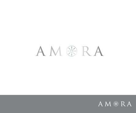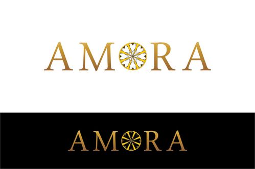One idea - google "hearts and arrows" under images. You will see images of the 8 arrow patten (8 arrows, in a radiating circular pattern). The gem will be cut to Hearts and Arrows specs so possibly integrating the 8 arrow circle design via a simple line drawing into the O of Amora would be a good combo for combining the name with the H&A (hearts and arrows) aspect of the gem.