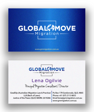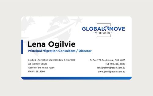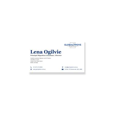 Please use the below on business card: Lena Ogilvie Principal Migration Consultant / Director GradDip (Australian Migration Law & Practice) LLB (Bach of Laws) Justice of the Peace (QLD) MARN: 2619266 Please make these lines smaller than the Name and Title in the first two lines: GradDip (Australian Migration Law & Practice) LLB (Bach of Laws) Justice of the Peace (QLD) MARN: 2619266