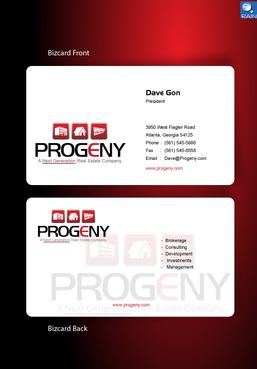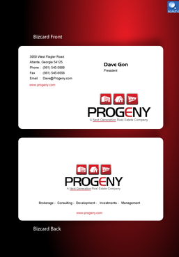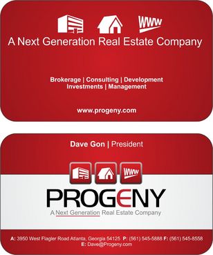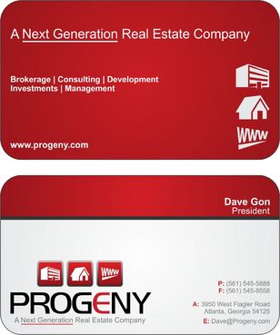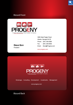 The back of the business card must contain the logo and slogan. In addition, the following descriptive words must be included somewhere in a unique format: Brokerage - Consulting - Development - Investments - Management And finally, the back of the business card must also contain the website address of the company - www.progeny.com