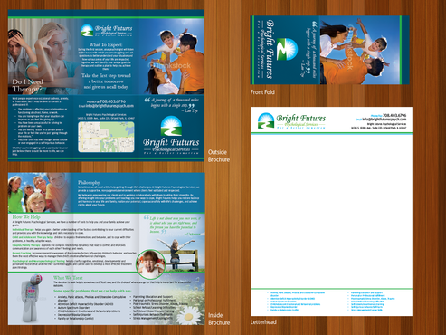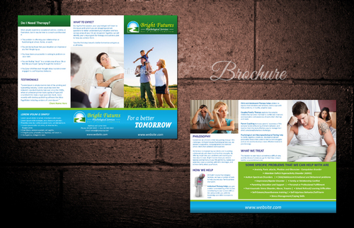 Tri-fold brochure for psychology practice. Looking for a brochure that does not conform to the three inner panels of the trifold (i.e. copy is not confined to three columns) but breaks the space up alternatively. Colors should compliment the colors in our logo but do not need to be the same-we just don't want anything that is too visually overstimulating. We will upload the copy to be arranged in the brochure.