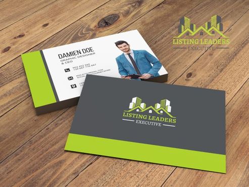 Two sided business cards, photo on front, logo on back as large as possible, gray background, lime green letters or white background gray & green letters